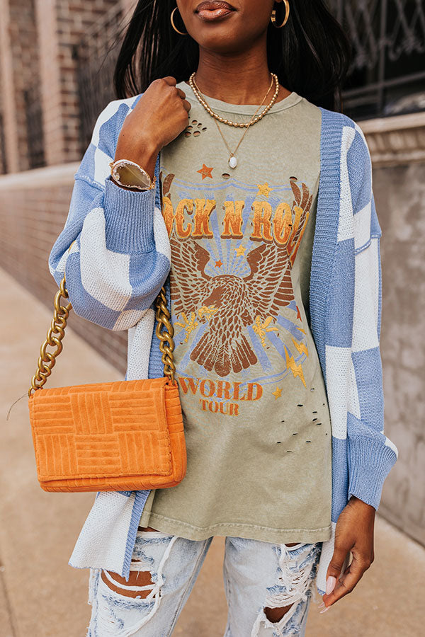 - Lightweight, green hued material with an eagle and ROCK N ROLL WORLD TOUR graphic design and distressed detail