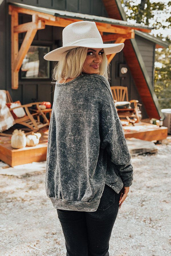 You'll look ready to rock and roll in this trendy new top! Features a black mineral washed material, wide round neckline, 'Rock N Roll' graphic design with boot accents, long loose sleeves with fitted cuffs, and a relaxed bodice that falls into a straight hemline with side slit accents.