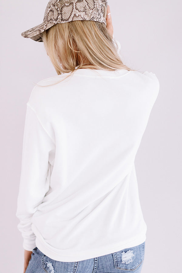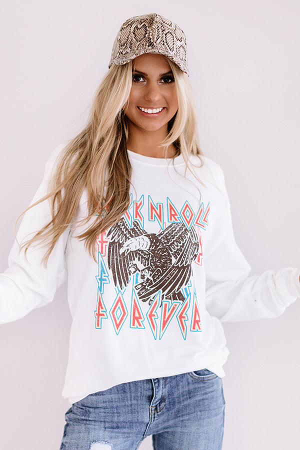 Add an edgy vibe to your fall wardrobe with our white "Rock N' Roll" sweatshirt featuring soft lightweight material, a high rounded neckline, long loose sleeves with fitted cuffs, a colorful front eagle graphic, and a relaxed silhouette that falls into a straight hemline! You can style this piece up with some distressed ankle skinnies, grey wedged booties, a snake print baseball cap, and a neutral backpack, but you can also dress it down with our pink "Dreamy Escape Jogger" and "The Delaney Sneaker in Gold!" Measurements