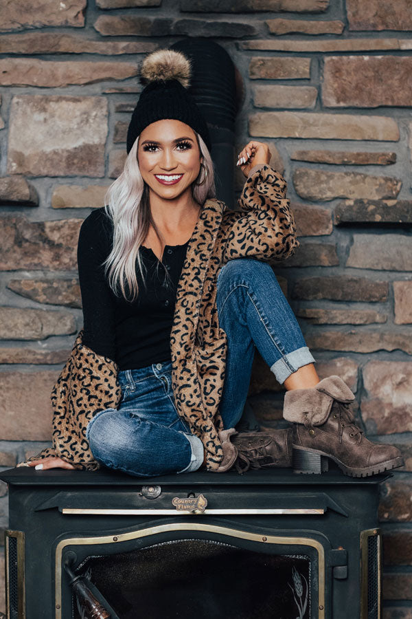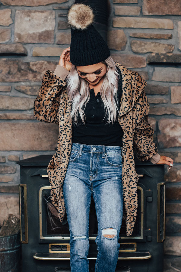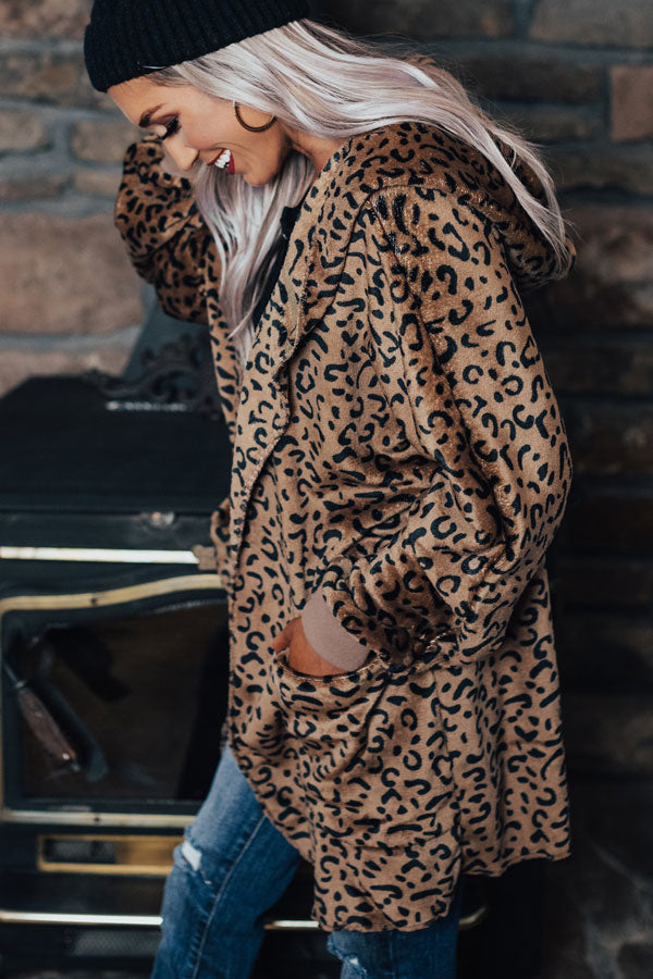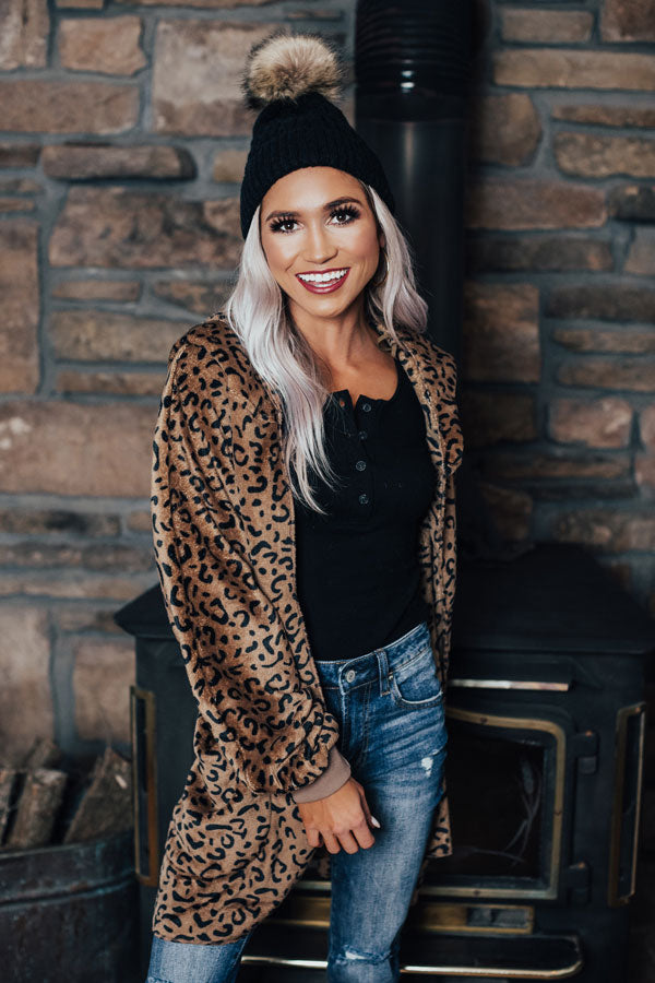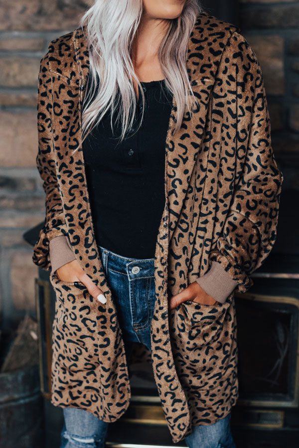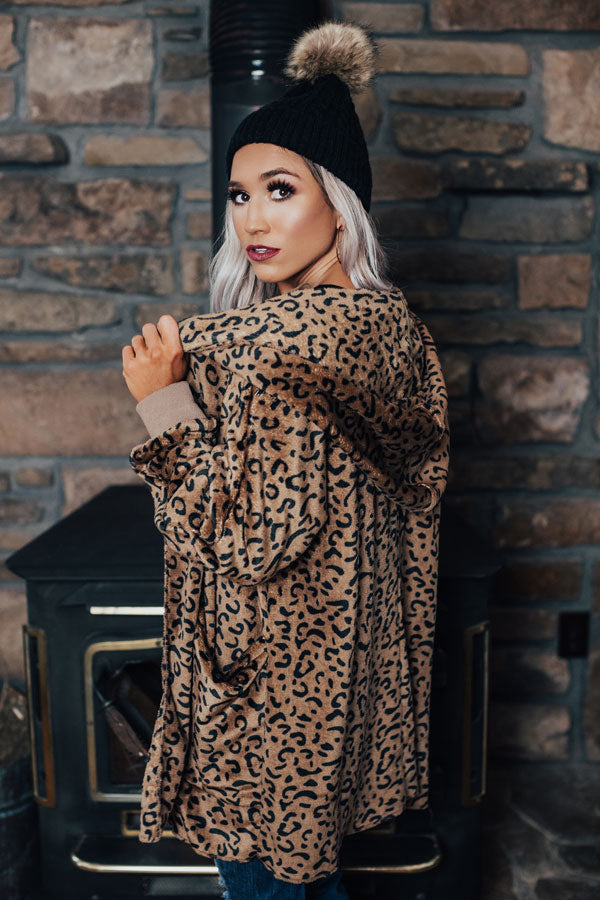 You will undoubtedly "rock the room" when you wear this adorable mocha colored cardigan featuring ultra soft lightweight material patterned with a bold black and brown spotted leopard print, long loose bishop sleeves with fitted cuffs, a hooded back, low hidden side pockets, and a relaxed open front silhouette that falls into a straight mid-thigh length hemline! You can layer this ultra warm and versatile piece with just about anything from a basic tank to a sweater, jeans to skirts or dresses, booties to wedges or sandals, clutches to totes, and hats to earrings! Measurements