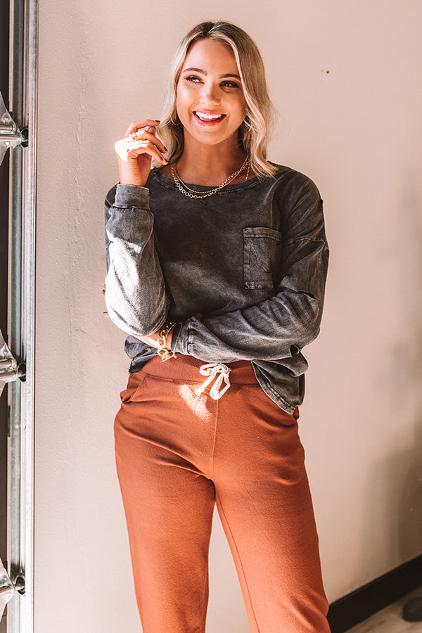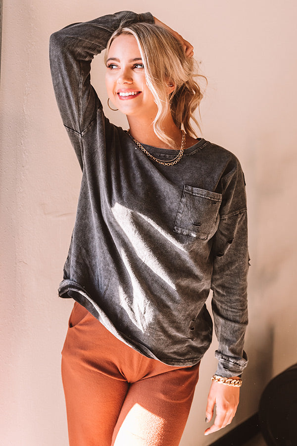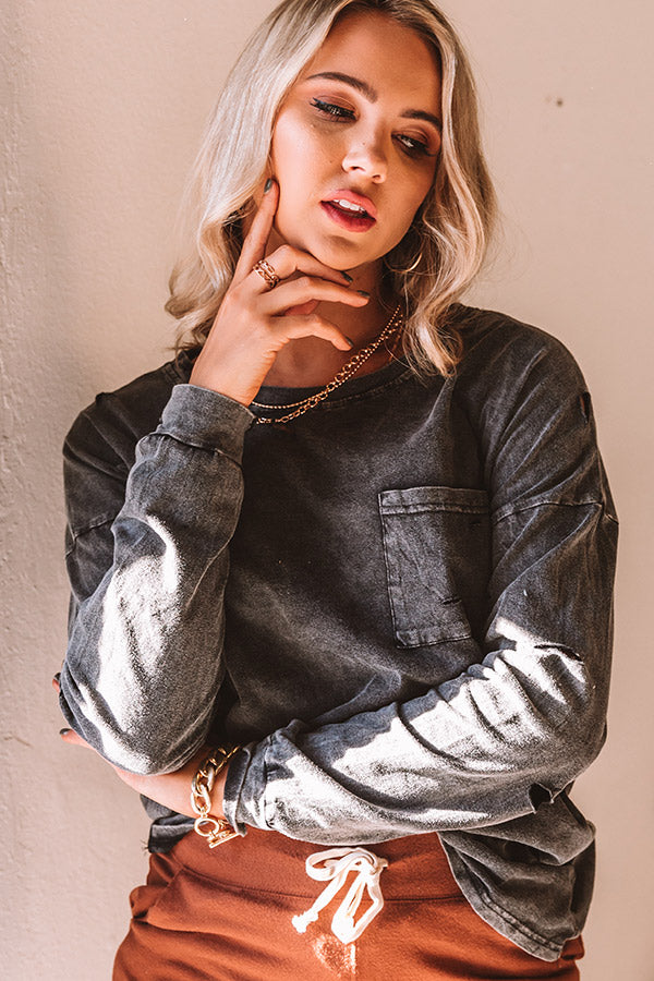 You are guaranteed to rock the room when you arrive in this trendy charcoal hued tee featuring soft lightweight mineral wash material with subtle distressed detailing, a high rounded neckline, long loose sleeves with fitted cuffs, a single accent chest pocket, and a slouched silhouette that ends in a straight hemline! Measurements
