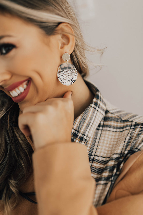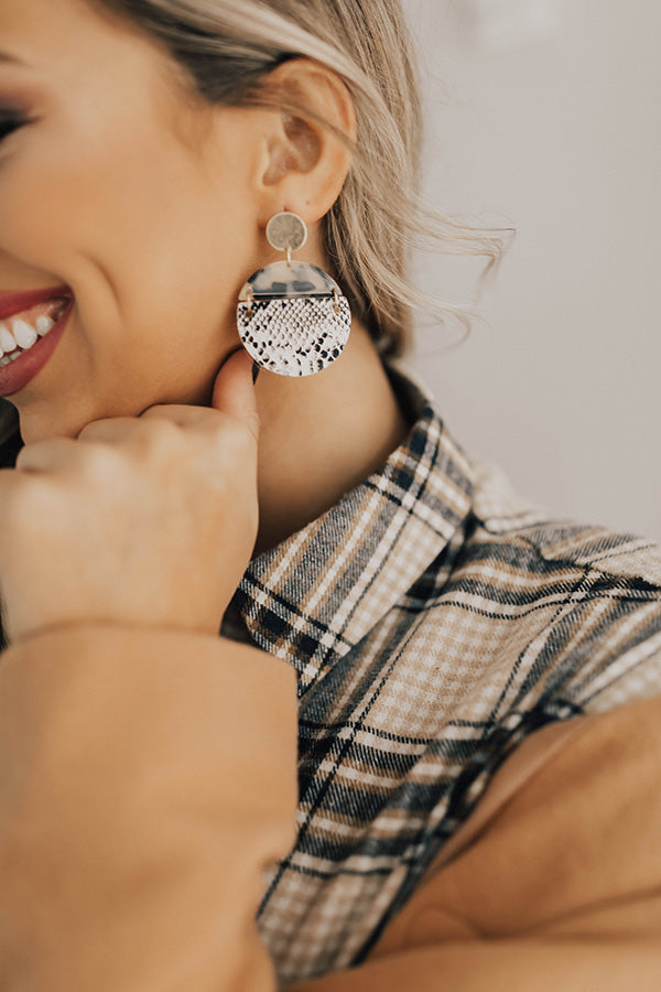 You will have a "rockstar moment" when you wear these stunning ivory earrings with their golden studs and hanging circles adorned with a snake print and marble pattern!