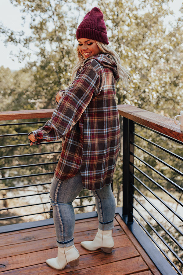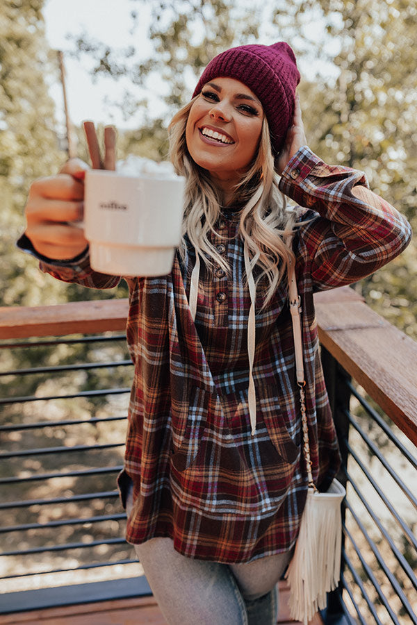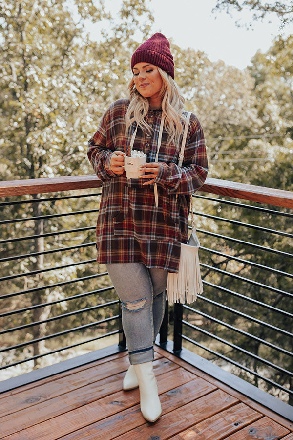 Plus Size - You are sure to make an entrance in our adorable 'Rocky Mountain Bliss' sweater featuring soft lightweight material patterned with a brown, red, and powder blue flannel pattern, long loose sleeves with button closure cuffs that can be rolled, a button up bodice with a v-cut neckline and drawstring hooded back, a large kangaroo front pocket, and a relaxed silhouette that falls into a rounded high/low mid-thigh length hemline!