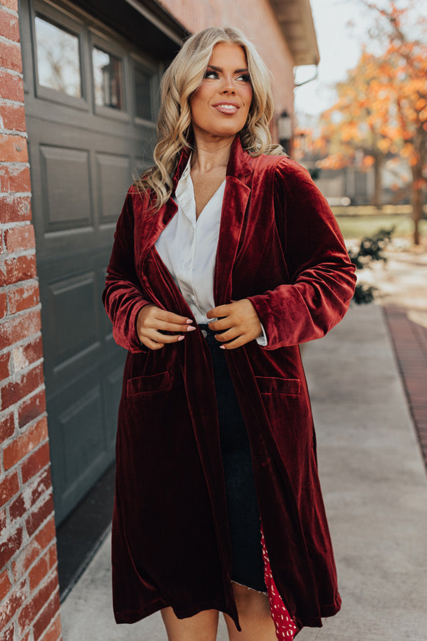 Romance Awaits Velvet Coat in Rust Curves