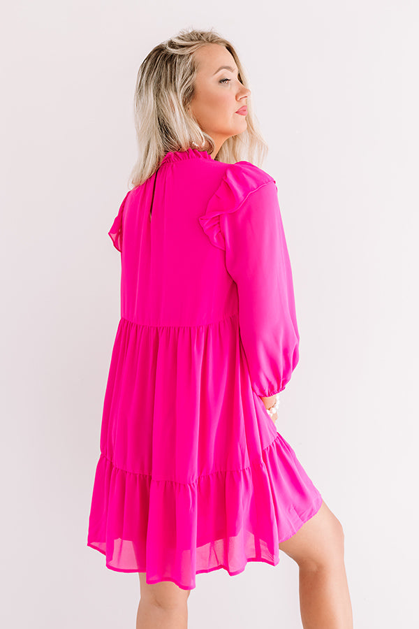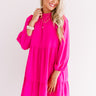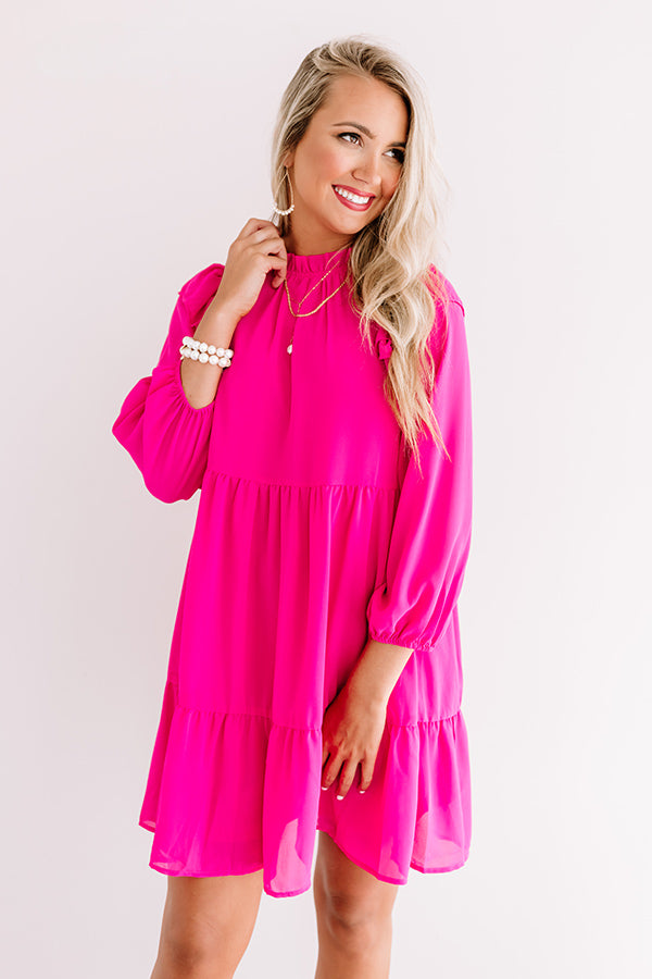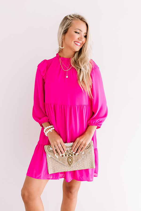 Get date night ready in our darling hot pink "Romantic History Shift Dress" featuring lightweight material, a high rounded neckline with ruffle trim detailing, loose 3/4-length bubble sleeves with ruffled accents shoulder seams and fitted elastic banded cuffs, a keyhole accented upper back with a button closure, and a relaxed tiered silhouette that falls into an uneven mid-thigh length hemline! We have styled this vibrant piece with some neutral heels and an embellished clutch, but you can also wear it with "The Real Deal Leopard Headband" and "The Carolina Heel in Leopard!" Measurements