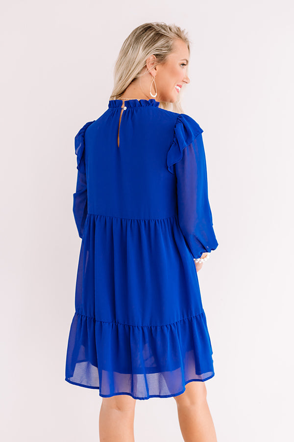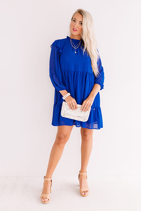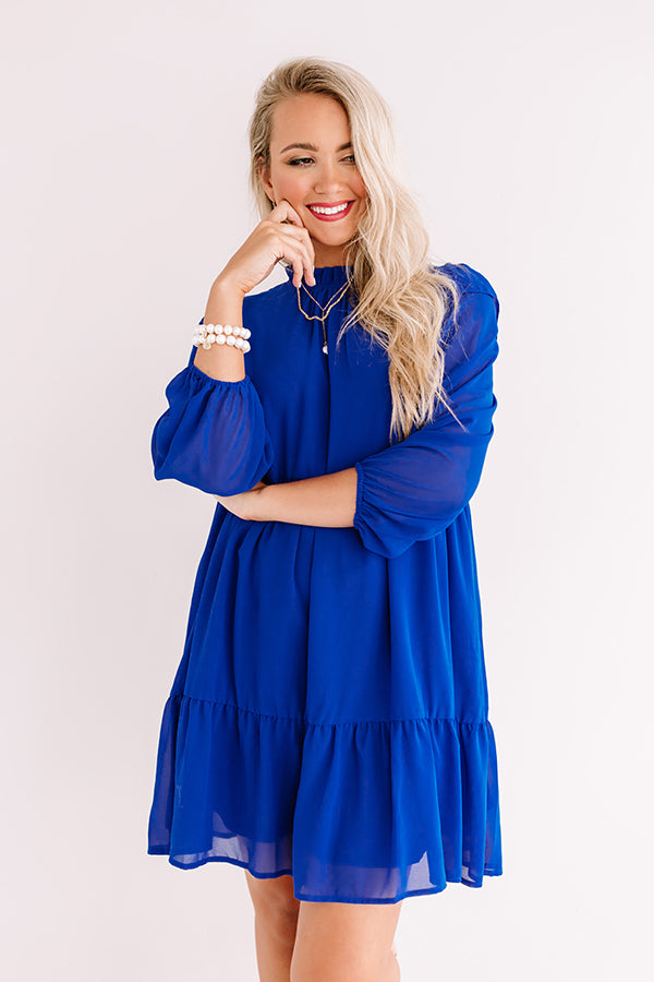 Get date night ready in our darling royal blue "Romantic History Shift Dress" featuring lightweight material, a high rounded neckline with ruffle trim detailing, loose 3/4-length bubble sleeves with ruffled accents shoulder seams and fitted elastic banded cuffs, a keyhole accented upper back with a button closure, and a relaxed tiered silhouette that falls into an uneven mid-thigh length hemline! We have styled this vibrant piece with some neutral heels and an embellished clutch, but you can also wear it with "The Real Deal Leopard Headband" and "The Carolina Heel in Leopard!" Measurements