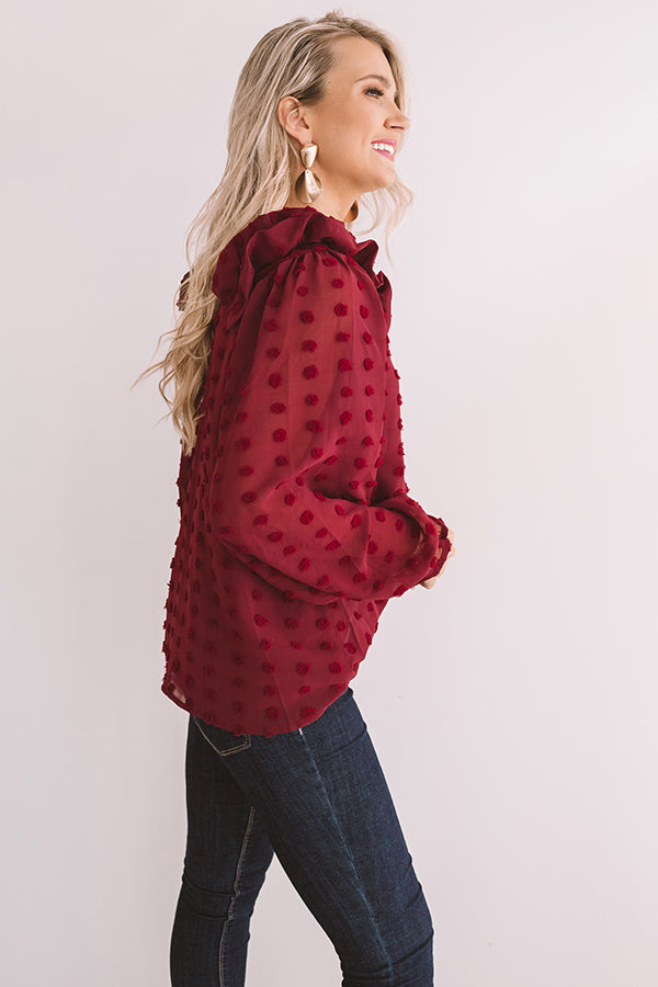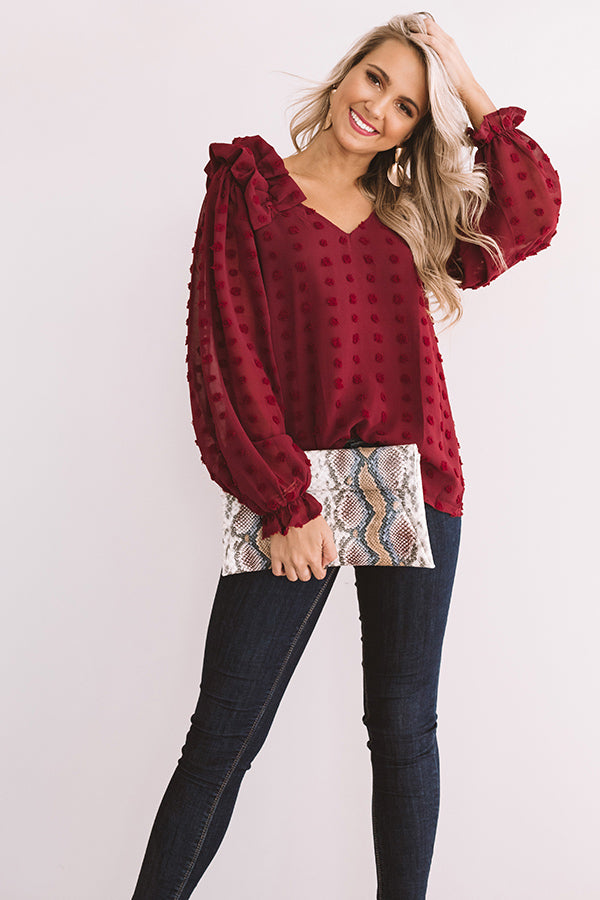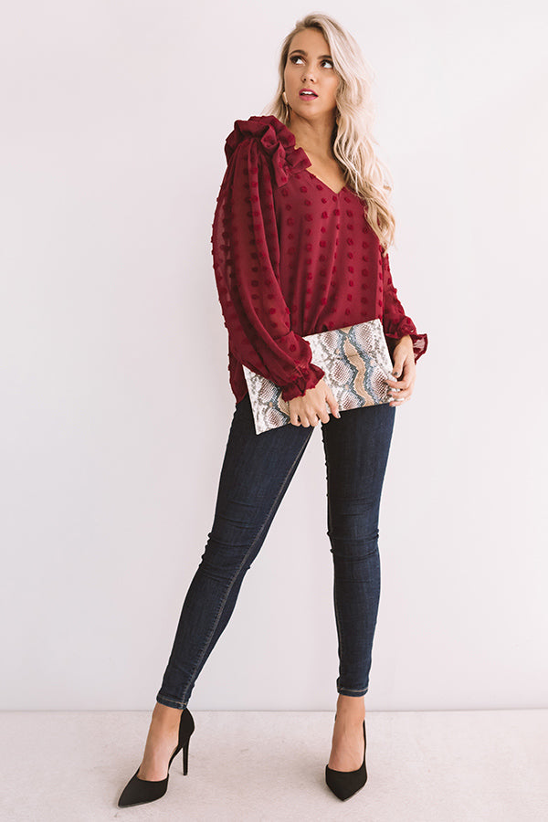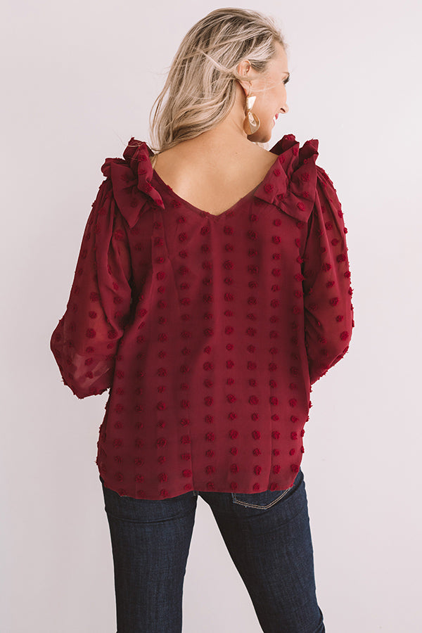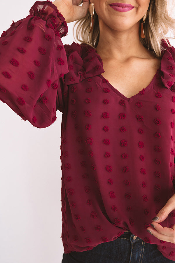 You are sure to look romantic while in Rome when you wear this elegant wine colored shift top featuring lightweight layered material, a subtle polka do textured pattern, a wide v-cut neckline and upper back, ruffled accent shoulders, semi sheer long sleeves with elastic banded cuffs, and a relaxed silhouette that falls into a straight hemline! Measurements