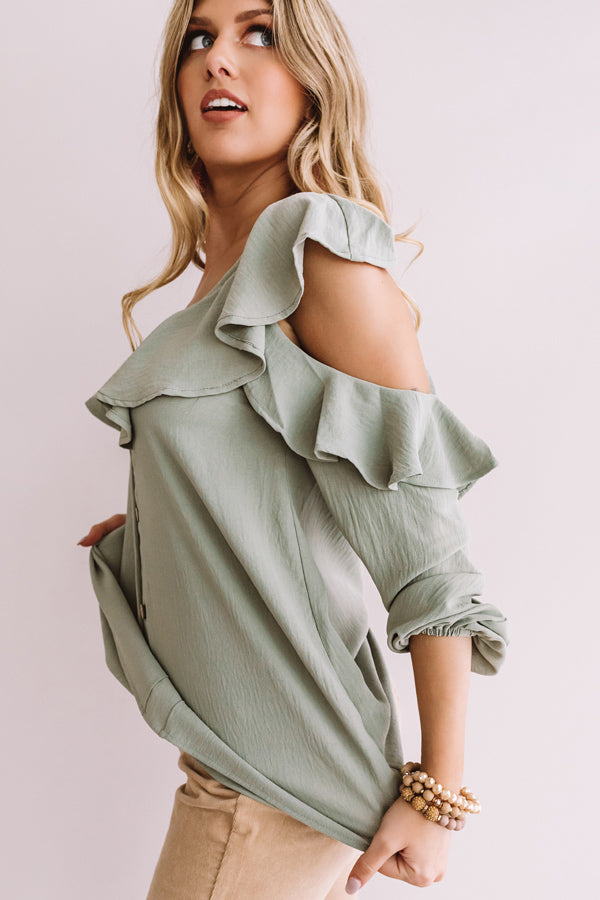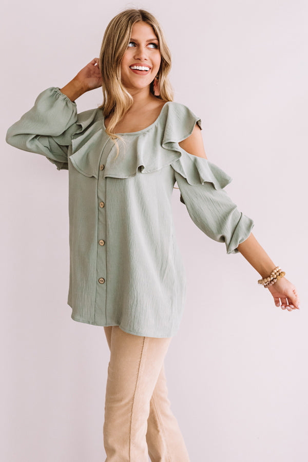 Transition to fall in style with this sage colored "Romantic Reflections" top featuring lightweight material, a wide scooped neckline, ruffle overlay seam accents, long bishop sleeves with fitted elastic band cuffs and cold shoulder cutouts, and a button up front silhouette that falls into a rounded hemline! We have styled this piece with some khaki flares, snake print booties, and a neutral fringe cross body, but you can also wear it with some charcoal flares, our "Bold Ambition Hat in Grey," and "The Seraphina Faux Leather Wedge in Grey!"