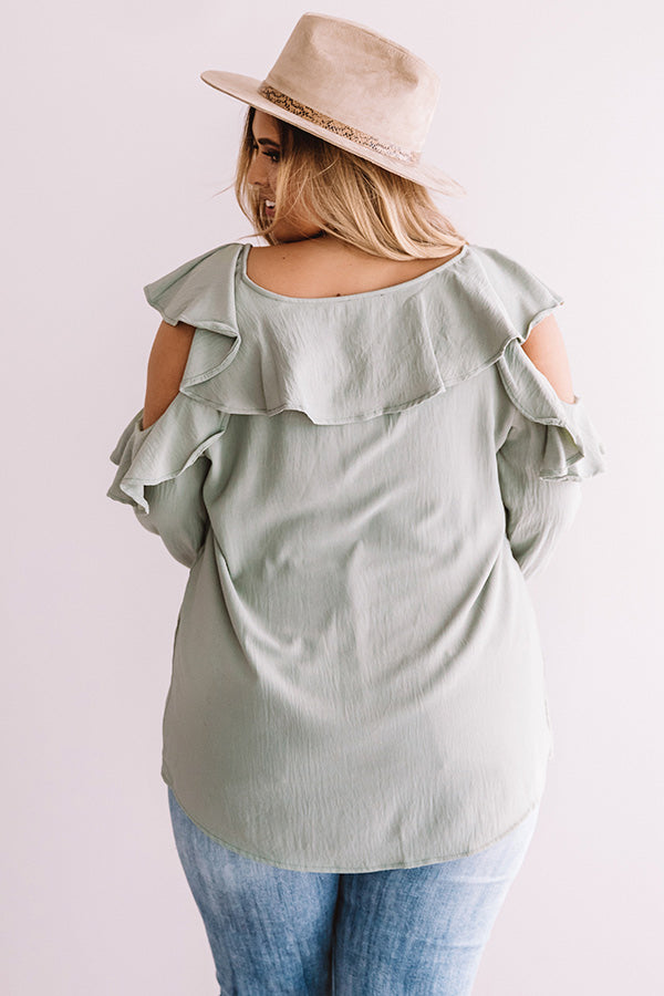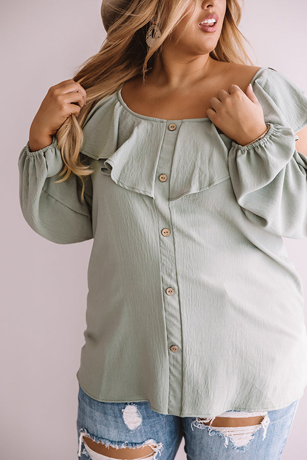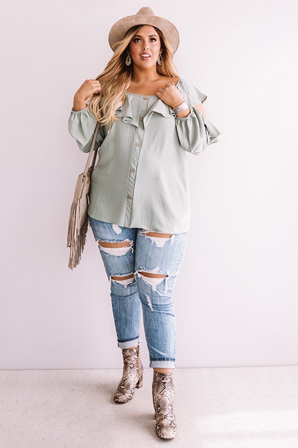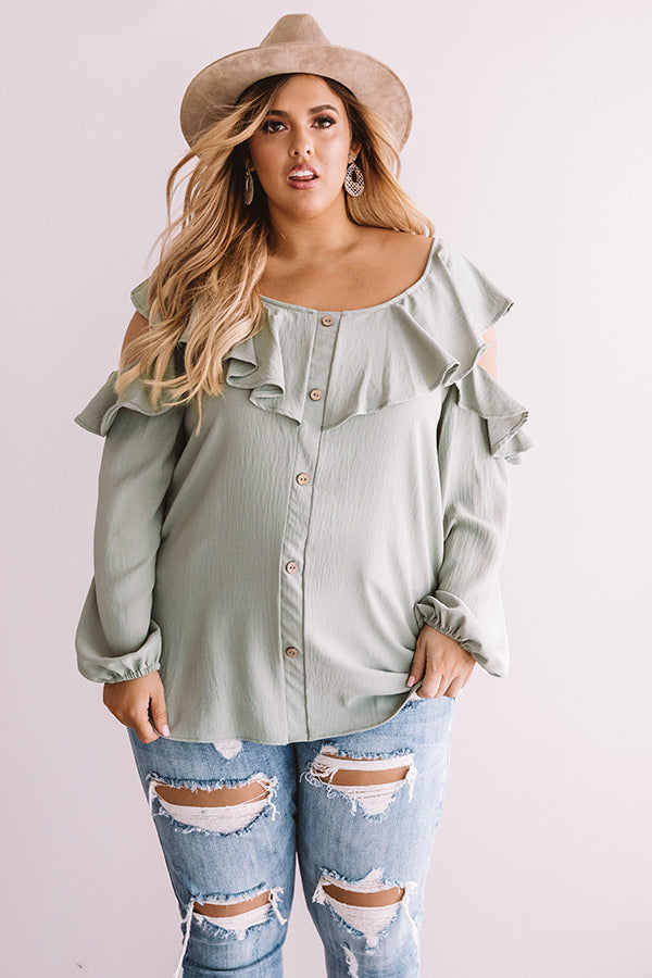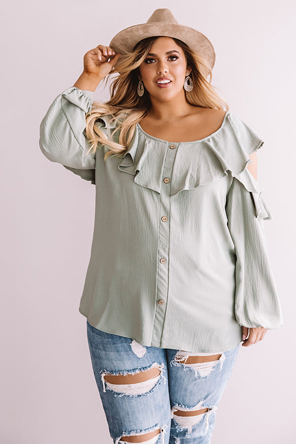Plus Size - Transition to fall in style with this sage colored "Romantic Reflections" top featuring lightweight material, a wide scooped neckline, ruffle overlay seam accents, long bishop sleeves with fitted elastic band cuffs and cold shoulder cutouts, and a button up front silhouette that falls into a rounded hemline! We have styled this piece with some distressed ankle skinnies, snake print booties, and a neutral fringe cross body and faux suede hat, but you can also wear it with some charcoal flares and "The Seraphina Faux Leather Wedge in Grey!" Measurements