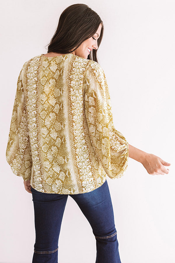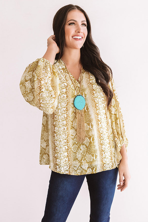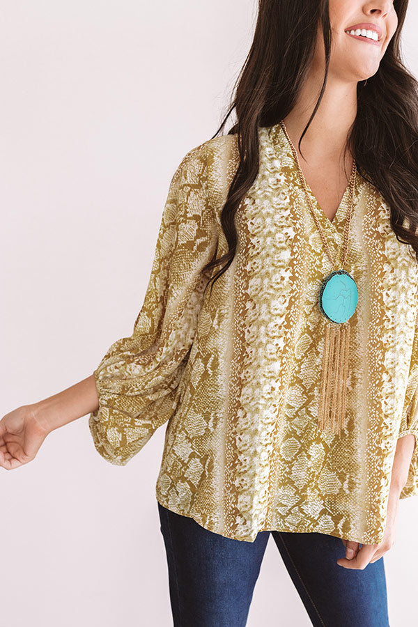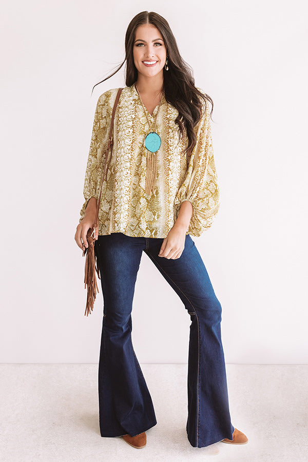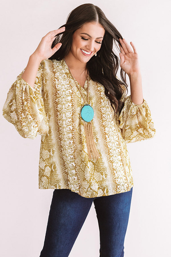 When packing for your "romantic retreat" you can't forget this flirty transitional piece featuring lightweight material, a mustard colored snake print pattern, a v-cut neckline, long loose bishop sleeves with elastic banded cuffs, and a breezy bodice that falls into a straight hemline! This dainty top is sure to show off your adventurous side, especially when you style it with some dark denim flares, a turquoise statement necklace, and a brown bootie and fringe crossbody, or with some distressed white skinnies, "The Lyra Heel in Iced Latte," and our "Plans In Paris Wool Hat in Taupe!" Measurements
