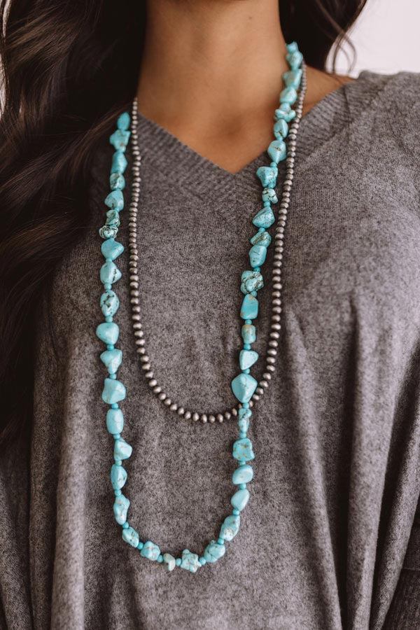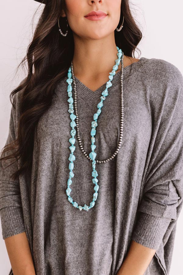 There is no better piece to wear on a "romantic retreat" than this statement necklace featuring two long pieces adorned with slate colored beads and abstract turquoise faux stones!