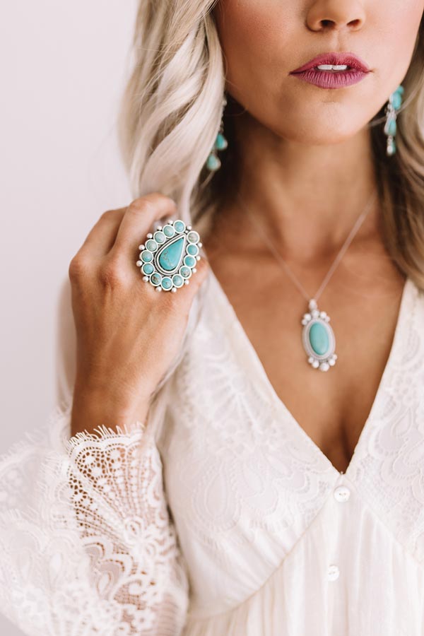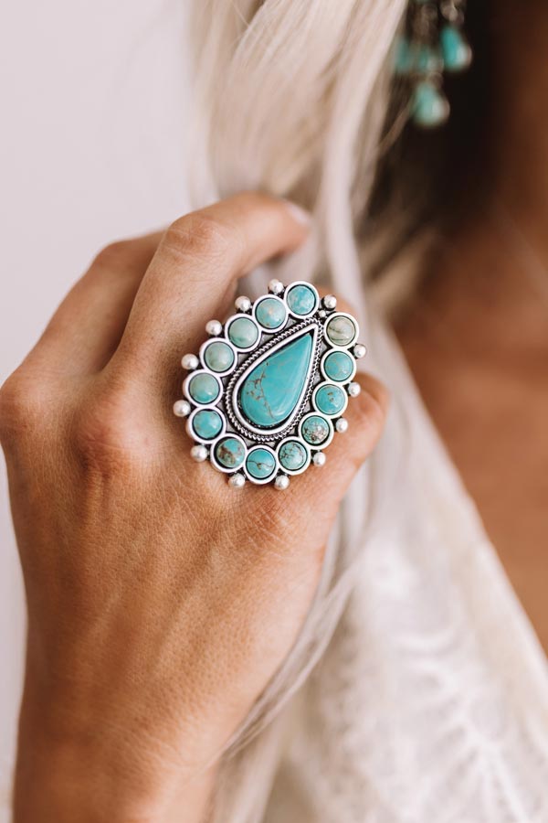 When "Rome is calling" put on your best jewelry like this statement ring featuring a large turquoise teardrop pendant surrounded by smaller circle faux stones set inside a silver band, and go!