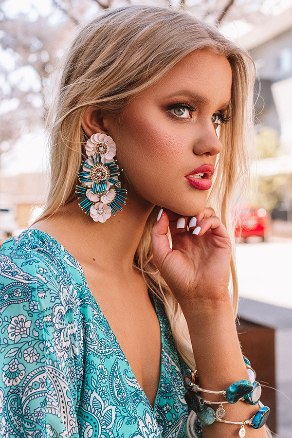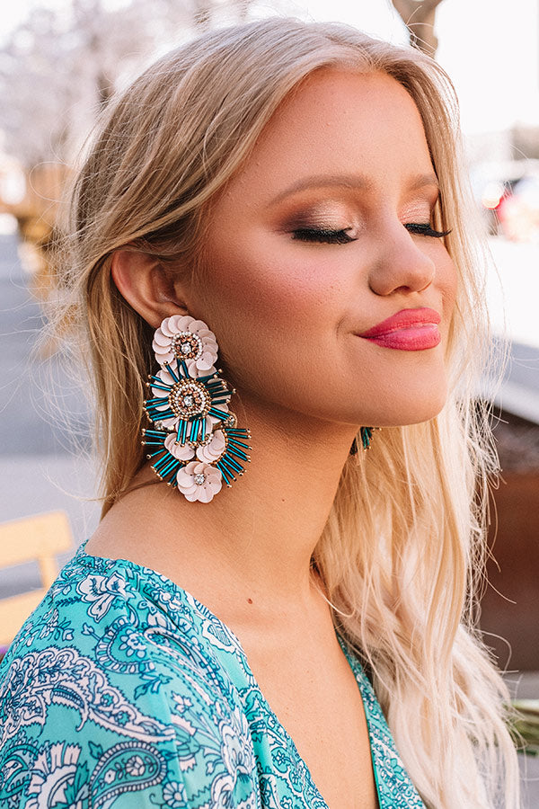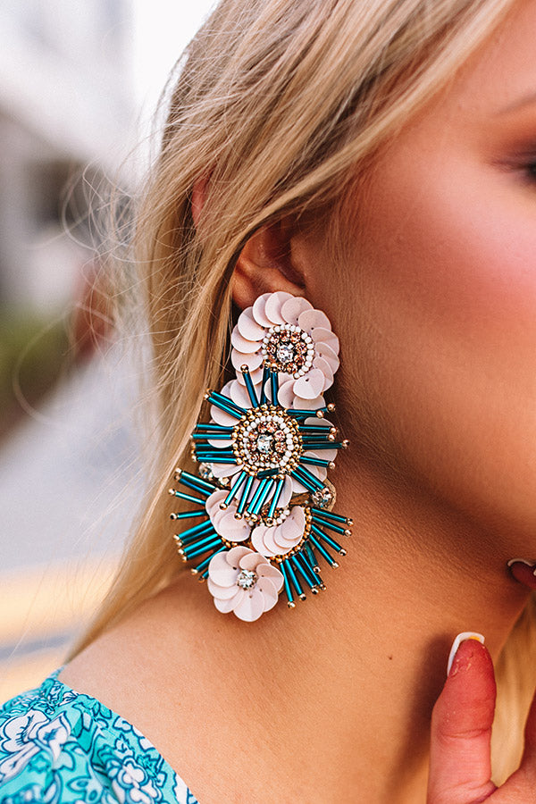 We have no doubt you will be as obsessed as we are with our stunning "Rooftop Garden" statement earrings featuring intricate white and blue sequins and beads!
