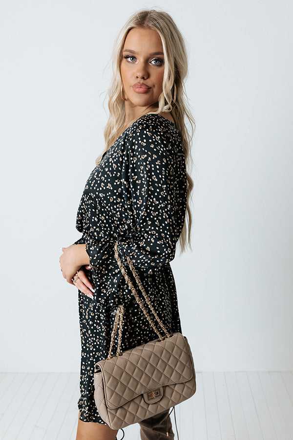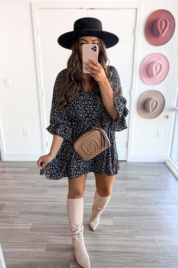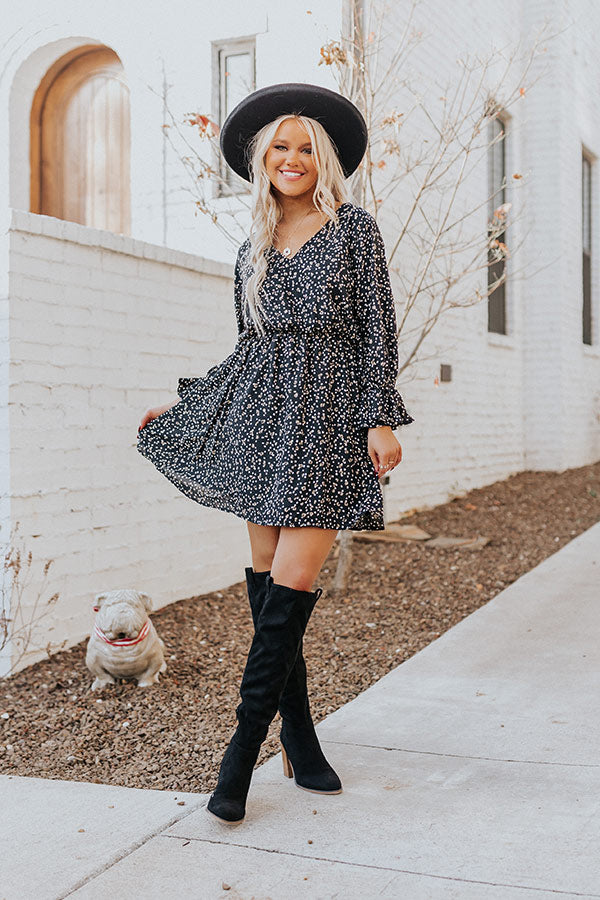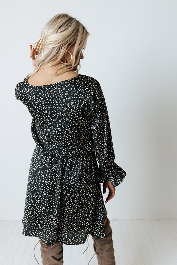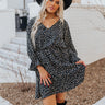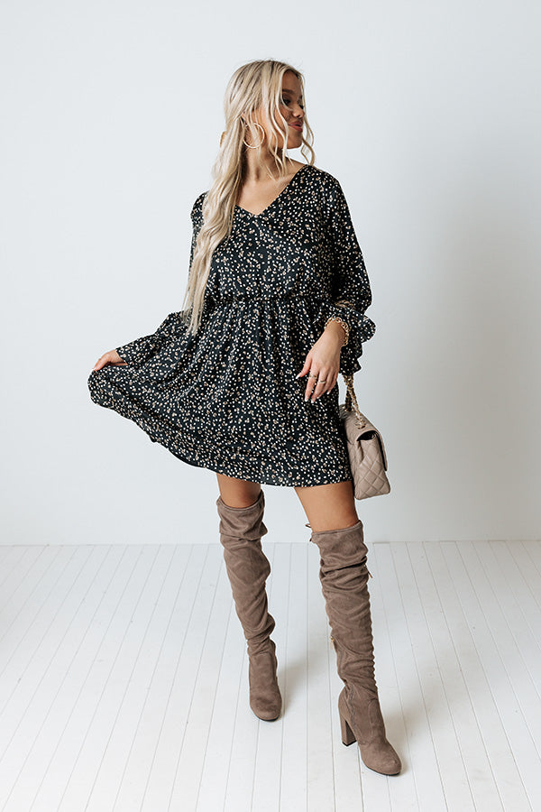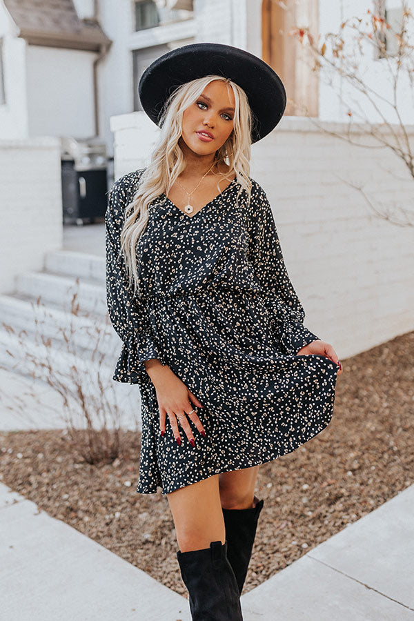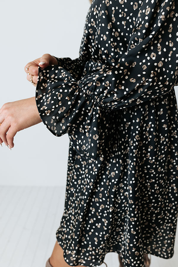 Arrive in style with our charming black 'Rooftop Memories' dress featuring lightweight material patterned with white and brown polka dots, a v-cut neckline, long bishop sleeves with flared cuffs, a cinched waistline, and a relaxed silhouette that falls into a straight mid-thigh length hemline!