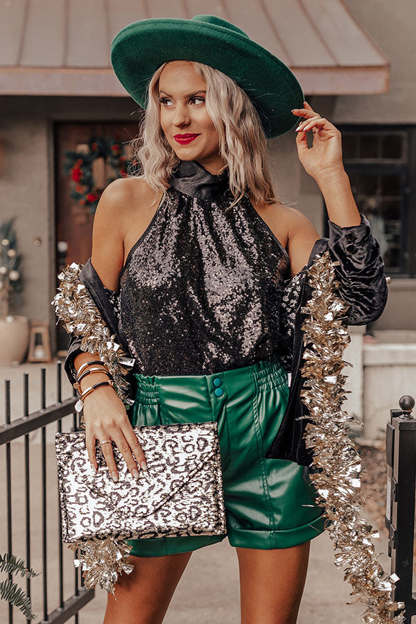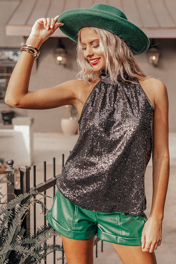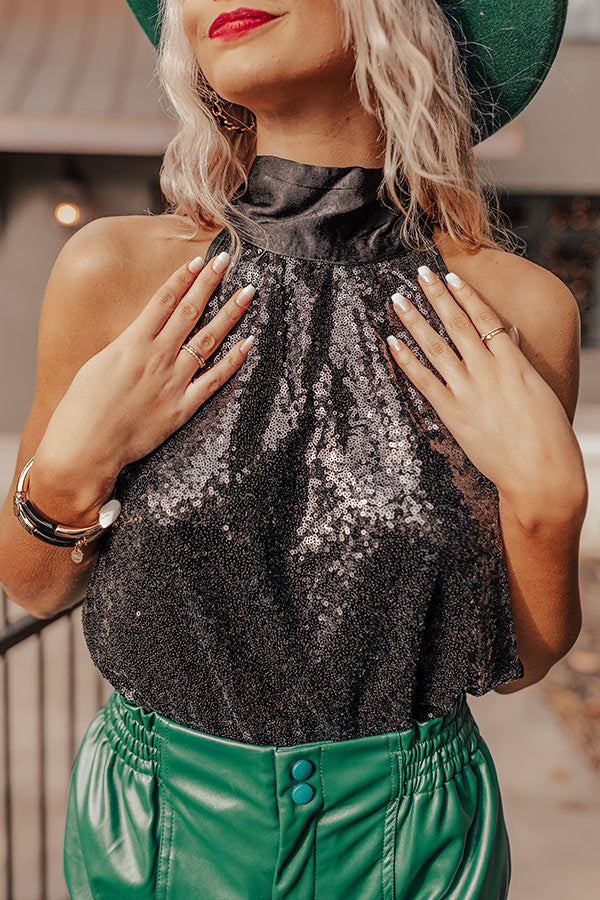 You are suer to create fun memories when you complete your look with this beautiful black top featuring shimmering sequins on the front and a solid back, a high collar with a sleeveless silhouette, a keyhole accented upper back with a large ribbon tie closure, and a relaxed silhouette that falls into a straight hemline!