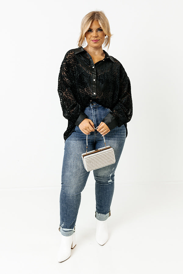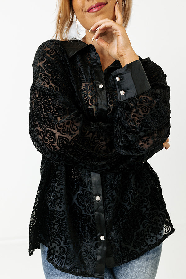 Go out in luxurious style in our 'Rooftop Soiree' burnout top! Features beautiful lightweight black chiffon and velvet materials, satin collar that goes into a button down front with gold and pearl accent buttons, long loose sleeves with satin cuffs and button closure, and a relaxed silhouette that falls into a rounded hemline.