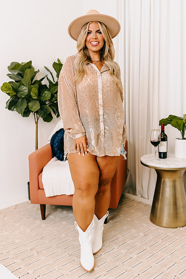 Go out in luxurious style in our 'Rooftop Soiree' burnout top! Features beautiful lightweight iced latte colored chiffon and velvet materials, satin collar that goes into a button down front with gold and pearl accent buttons, long loose sleeves with satin cuffs and button closure, and a relaxed silhouette that falls into a rounded hemline.