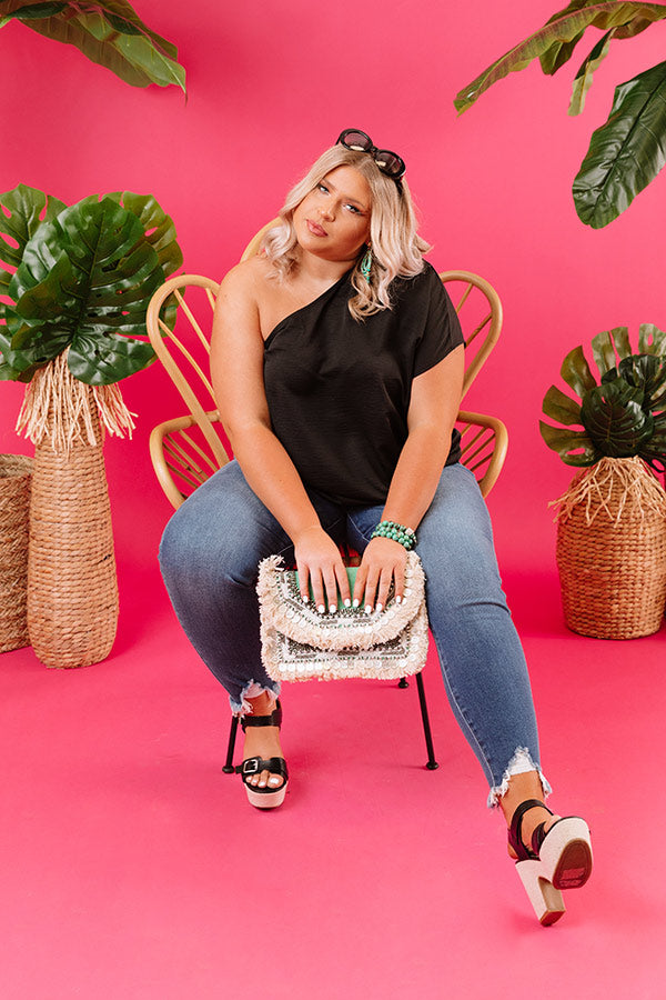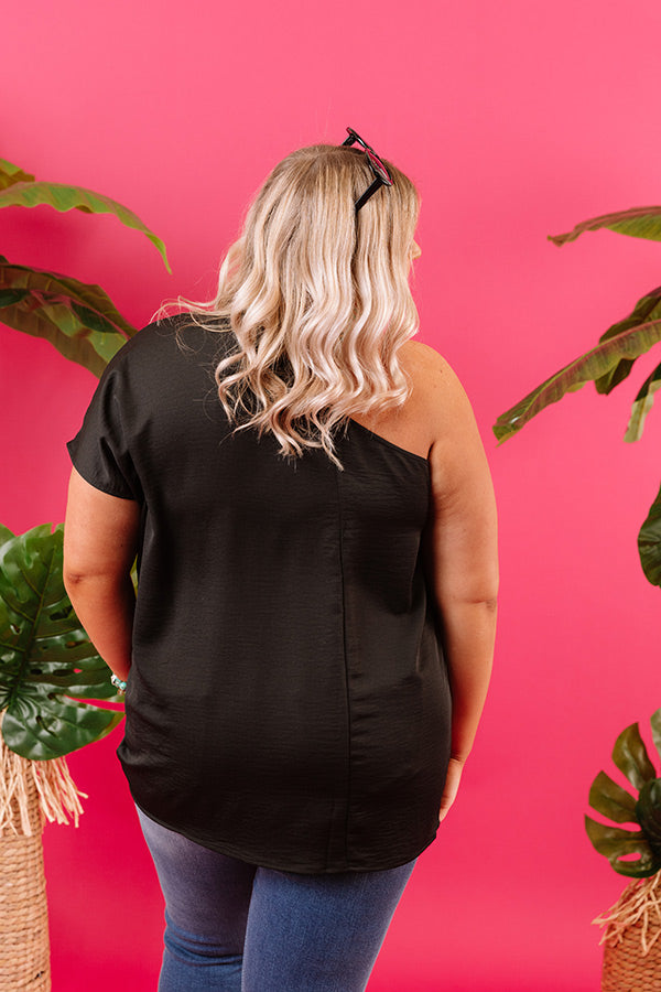 Plus Size - Enjoy those rooftop views in style with this elegant black top featuring lightweight breezy material, a diagonal neckline with a single short bat wing sleeve, and a relaxed silhouette that falls into a straight hemline! Measurements
