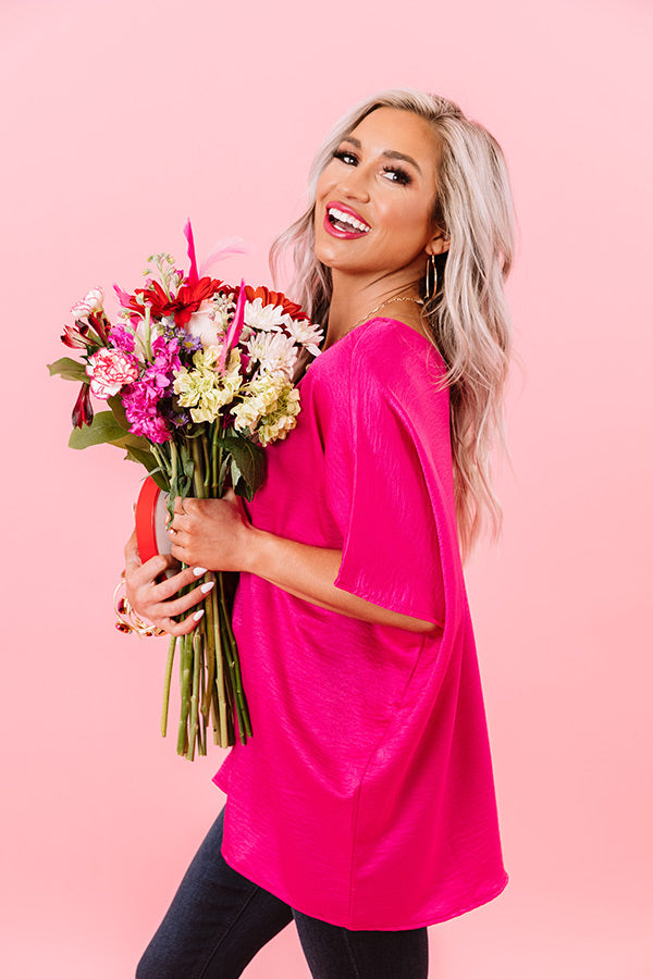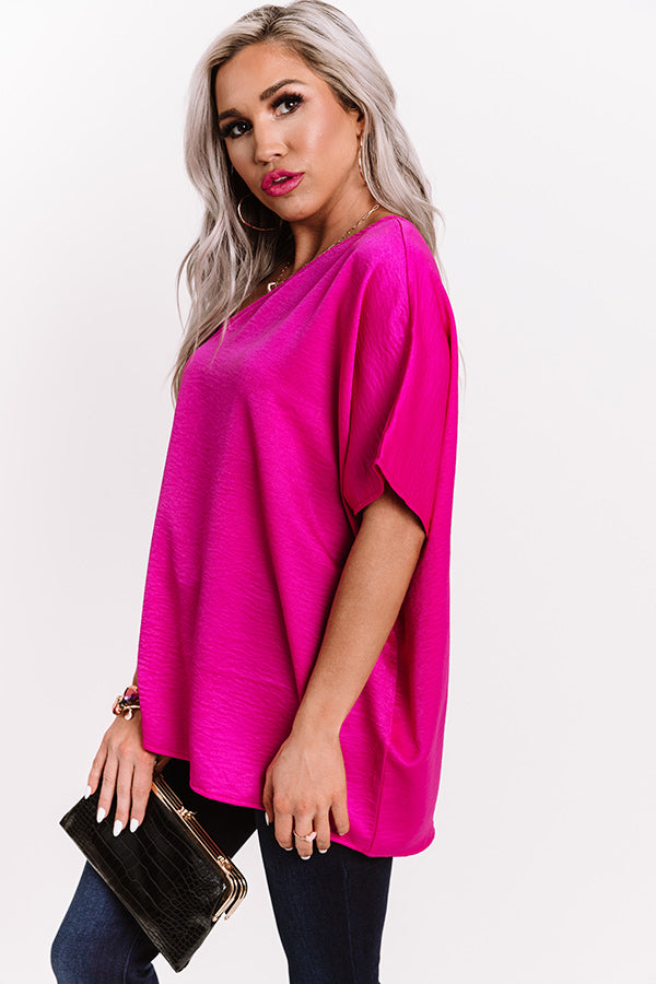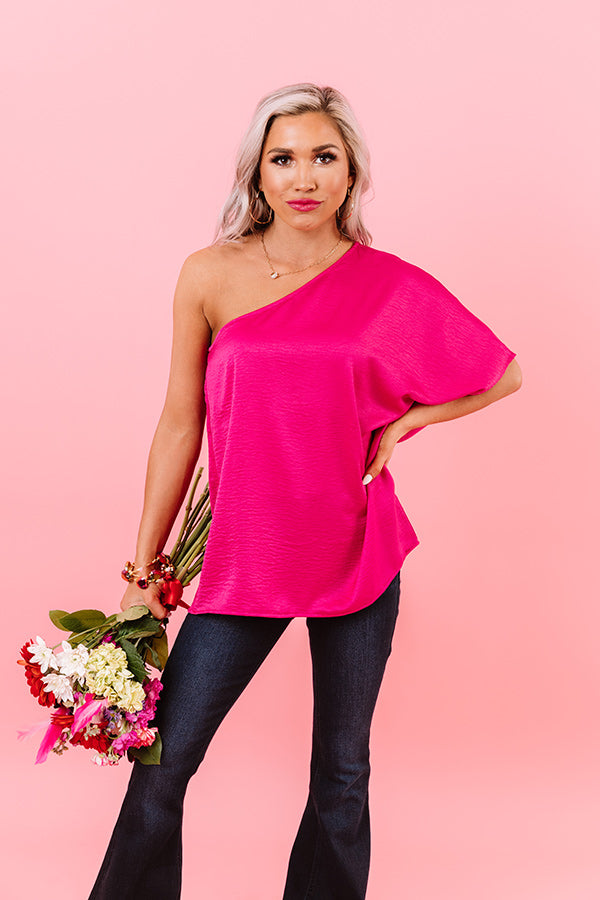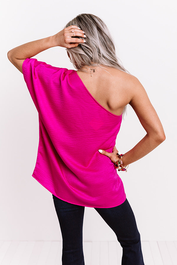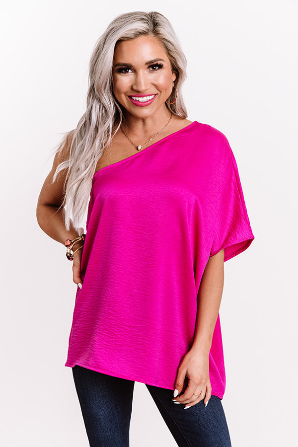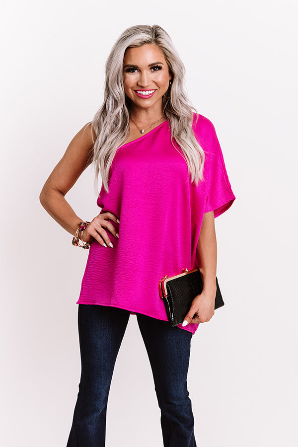 Enjoy those rooftop views in style with this elegant fuchsia colored top featuring lightweight breezy material, a diagonal neckline with a single short sleeve, and a relaxed silhouette that falls into a straight hemline! Measurements