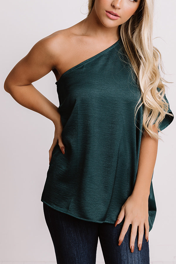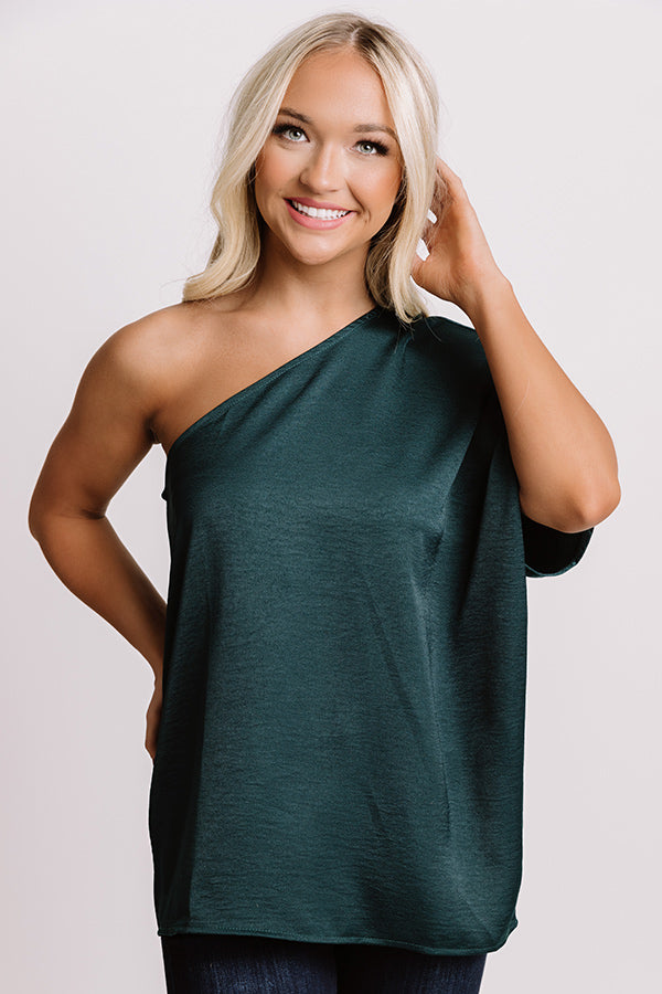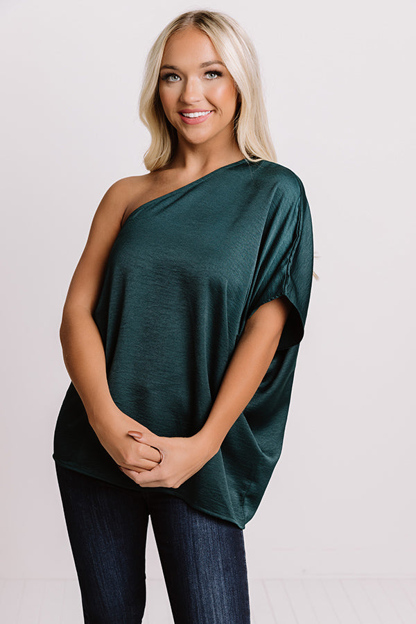 Enjoy those rooftop views in style with this elegant hunter green colored top featuring sleek lightweight breezy material, a diagonal neckline with a single short loose sleeve, and a relaxed silhouette that falls into a straight hemline that looks perfect front tucked! Measurements