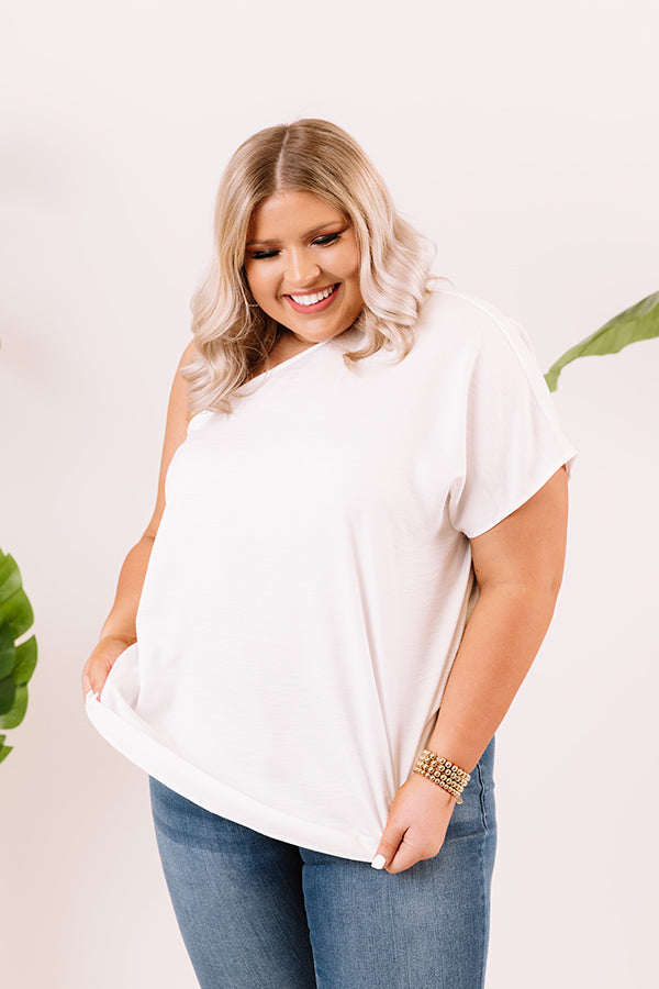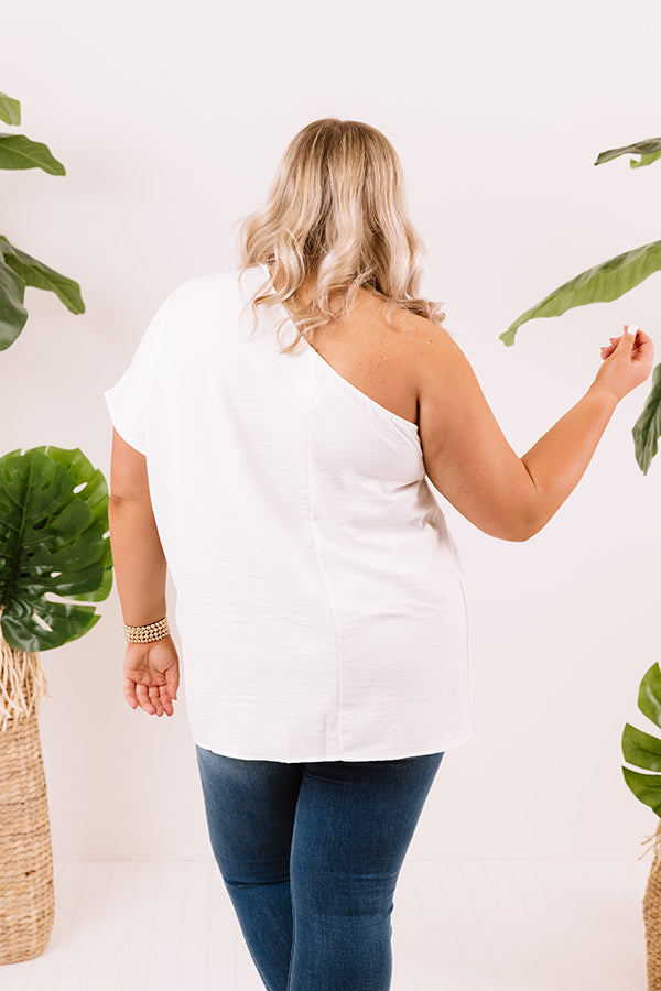 Plus Size - Enjoy those rooftop views in style with this elegant white top featuring lightweight breezy material, a diagonal neckline with a single short bat wing sleeve, and a relaxed silhouette that falls into a straight hemline! Measurements