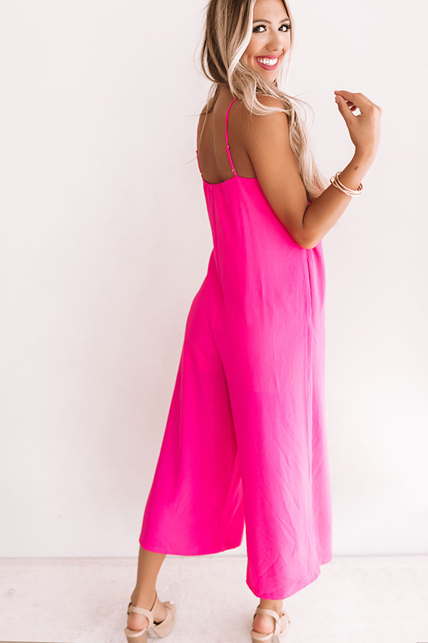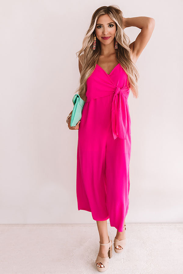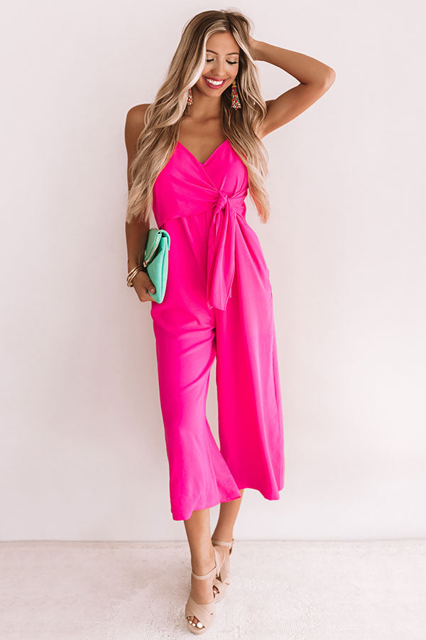 Don't let the haters stop you from doing your thing, so if you want to wear a hot pink jumpsuit, then wear this jumpsuit! This piece will step up your rooftop party style with its adjustable spaghetti straps, oversized breezy pant legs, and a wrapped bodice with a tie closure! Pair this romantic sweetie with our black "Layla Heel" and black "Penelope Clutch" for a simple but outstanding look! Measurements