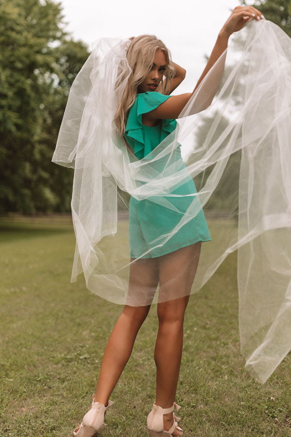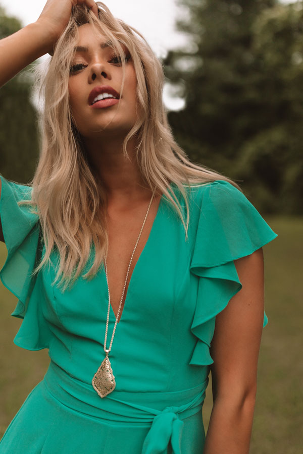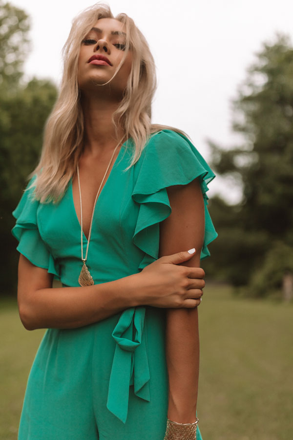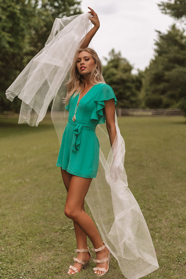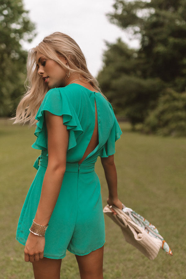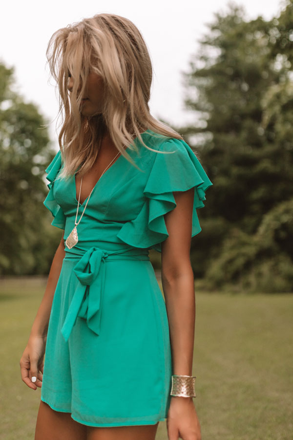 We believe you can accomplish anything when you're wearing a romper! Especially when that romper has ruffled sleeves, a tie belt, and an attractive back that has an oversized keyhole cutout with a button closure and zipper! Step up your summer style by pairing this green piece with some wedges and a bracelet set! Measurements