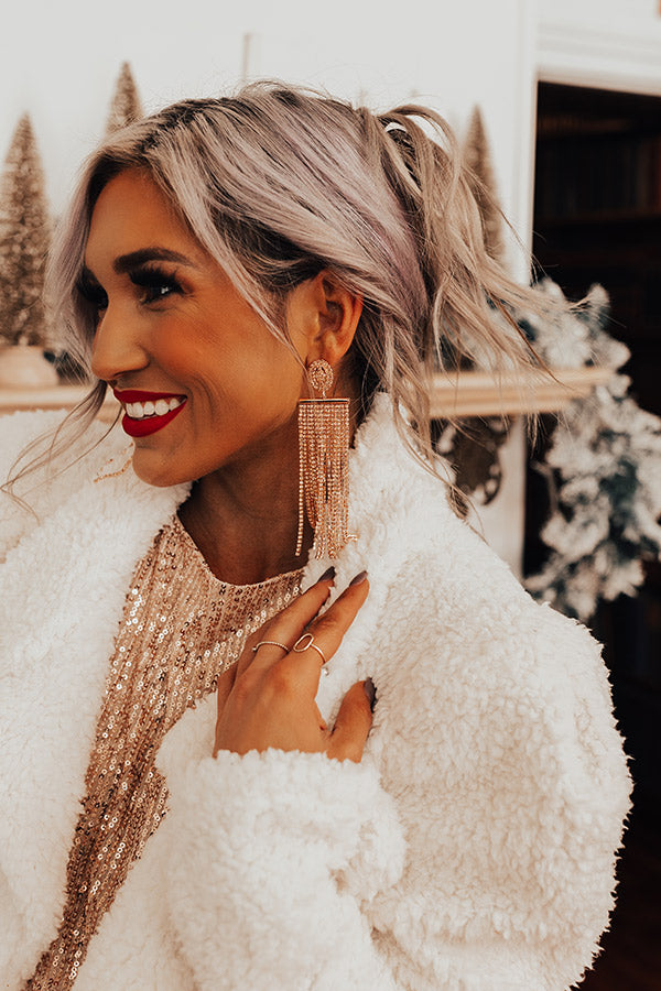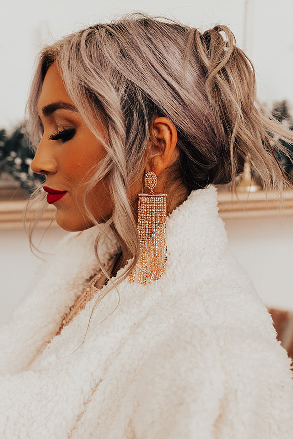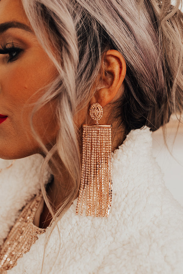 Make getting glammed up look easy with our stunning 'Room With A View Earrings' featuring gold studs with shimmering shoulder-length rhinestone tassels!