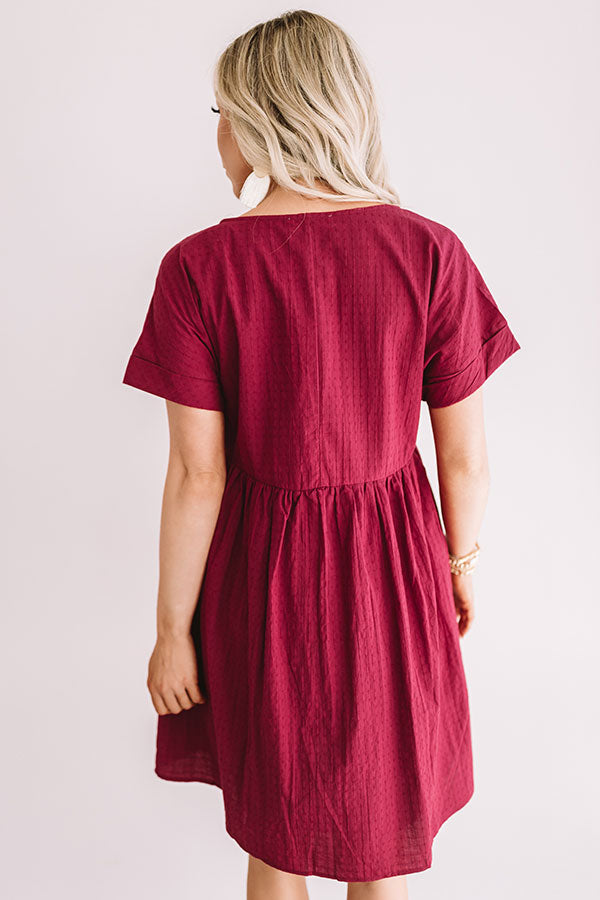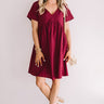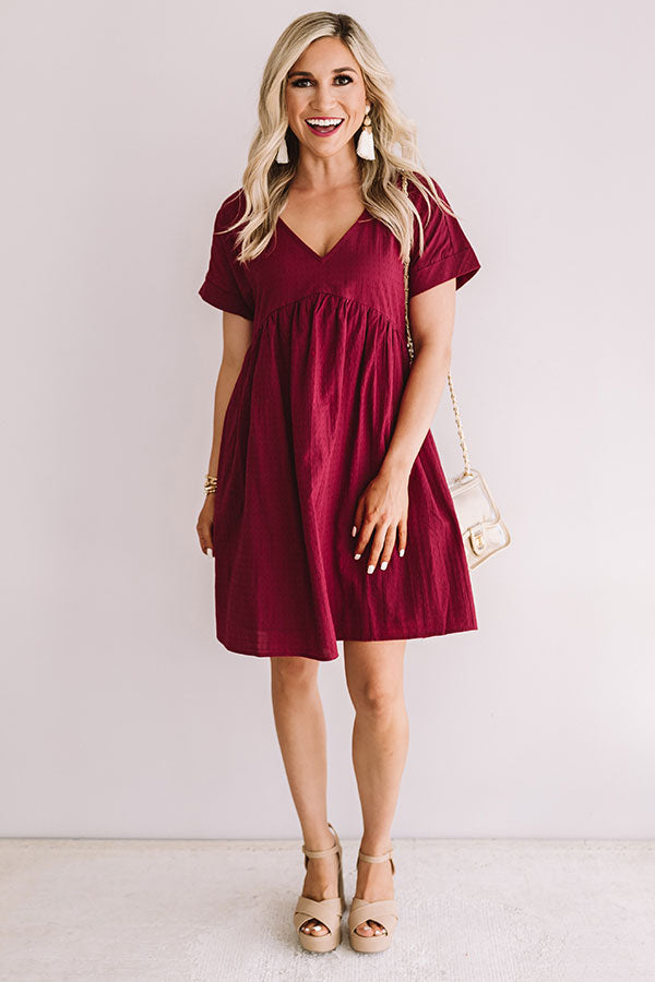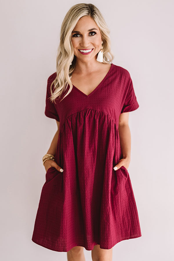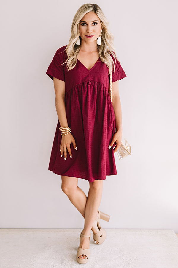Root for your favorite team in style with this wine babydoll dress featuring short sleeves, a v-neck, loose fit, and knee length hem! Style with some white statement earrings, nude platform heels, and a transparent crossbody for a trendy game day look, or you can pair it with a camel accessories like our "Estes Park Bootie" and "The Aurora Hat in Camel" for an adorable fall weekend look! Measurements