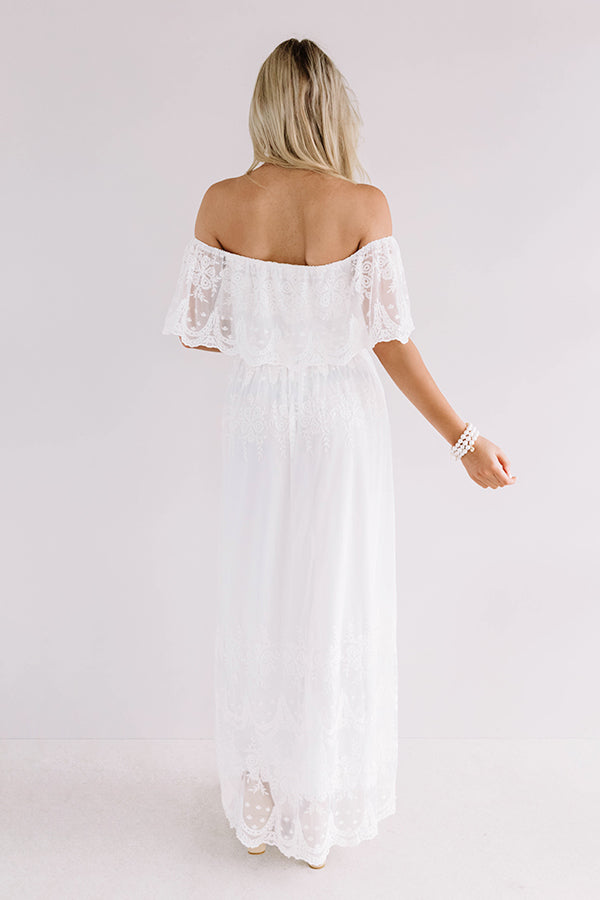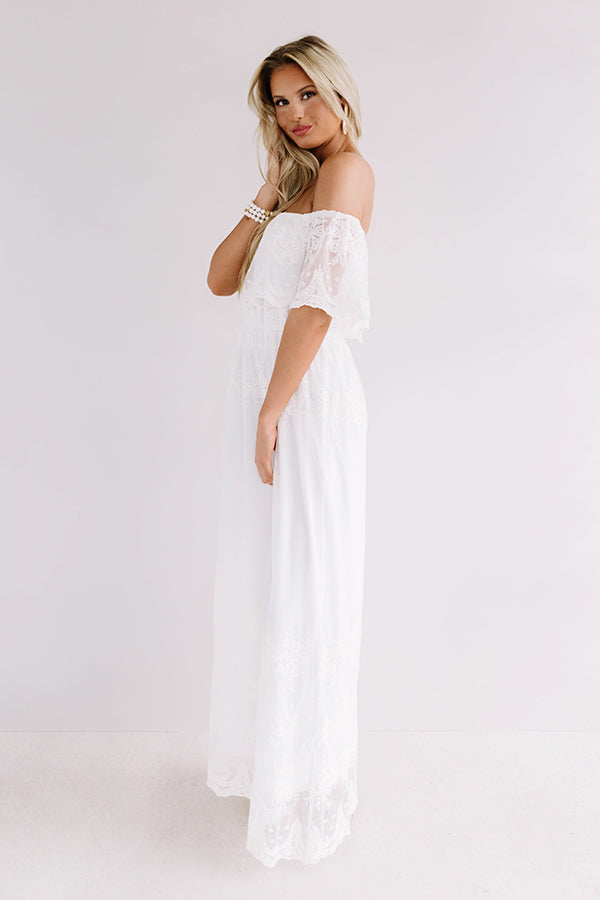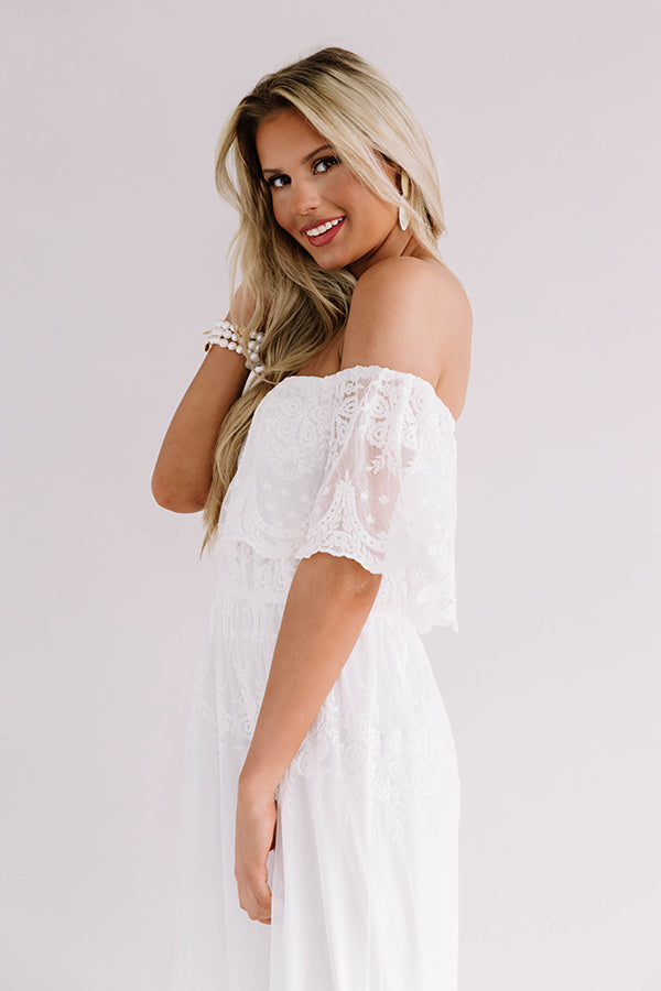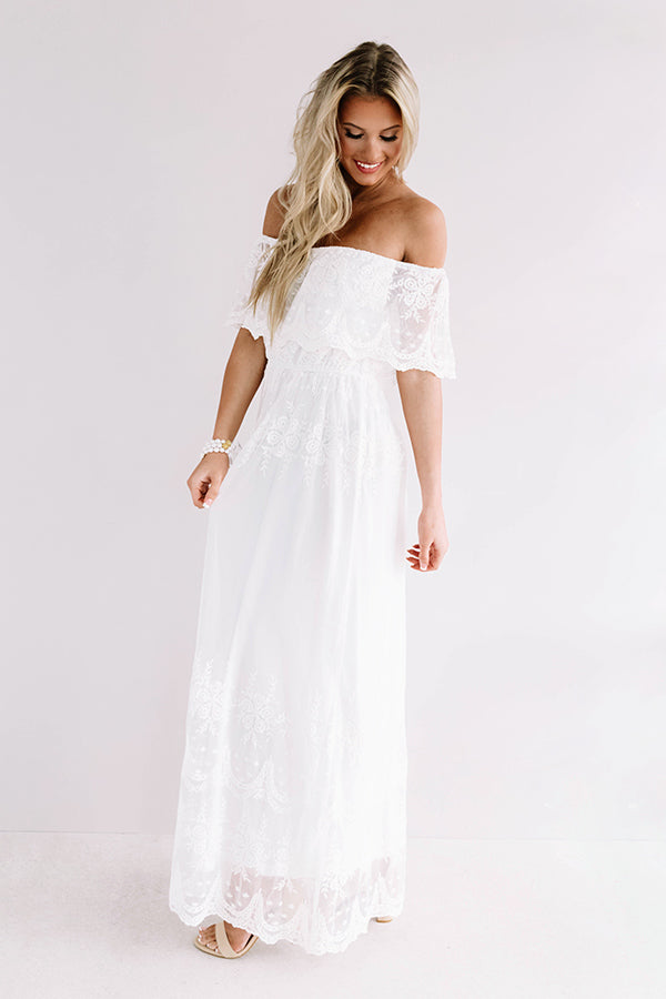 Whether you are headed to a date or a "rose garden gala," this darling white maxi dress is the perfect piece! It features lightweight breezy semi-sheer lace material with a sewn in slip underneath, an elastic off shoulder fit with a straight neckline, short overlaid drop sleeves with scalloped trim, a cinched waistline, and a relaxed skirt silhouette that falls into an uneven floor-length hemline! We have styled this elegant piece with a neutral heel and beaded clutch, but you can add a pop of color by wearing it with "The Everly Patent Heel in Blush" and our chic "Sunshine Suite Sunnies in Blush!" Measurements