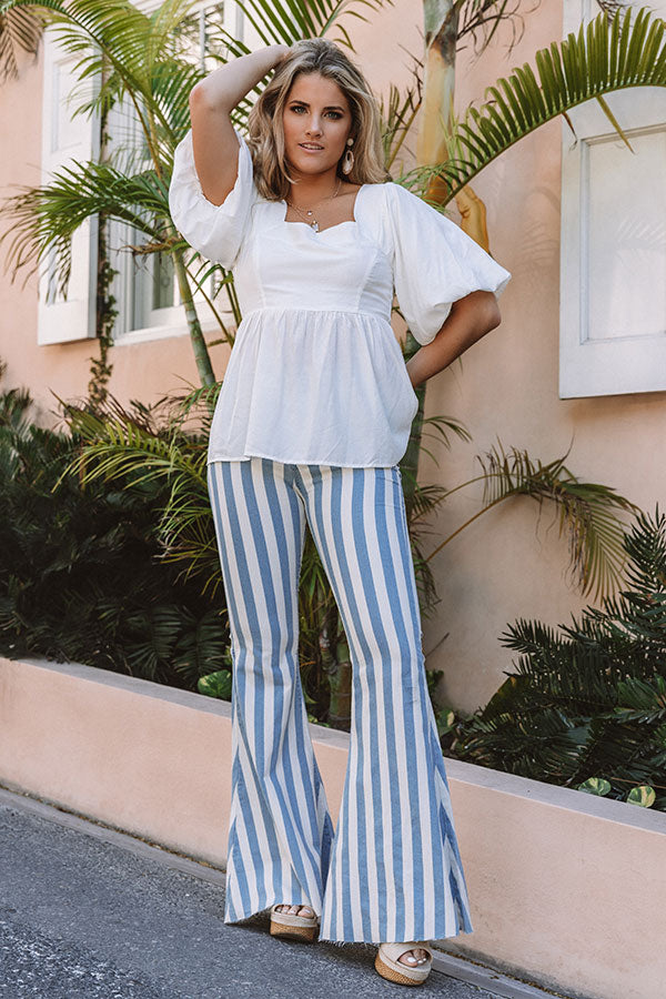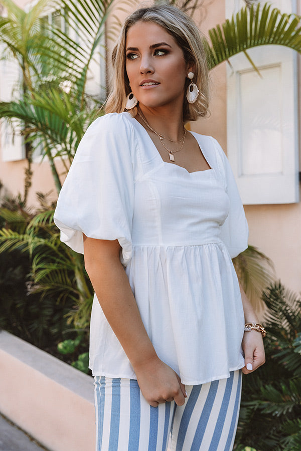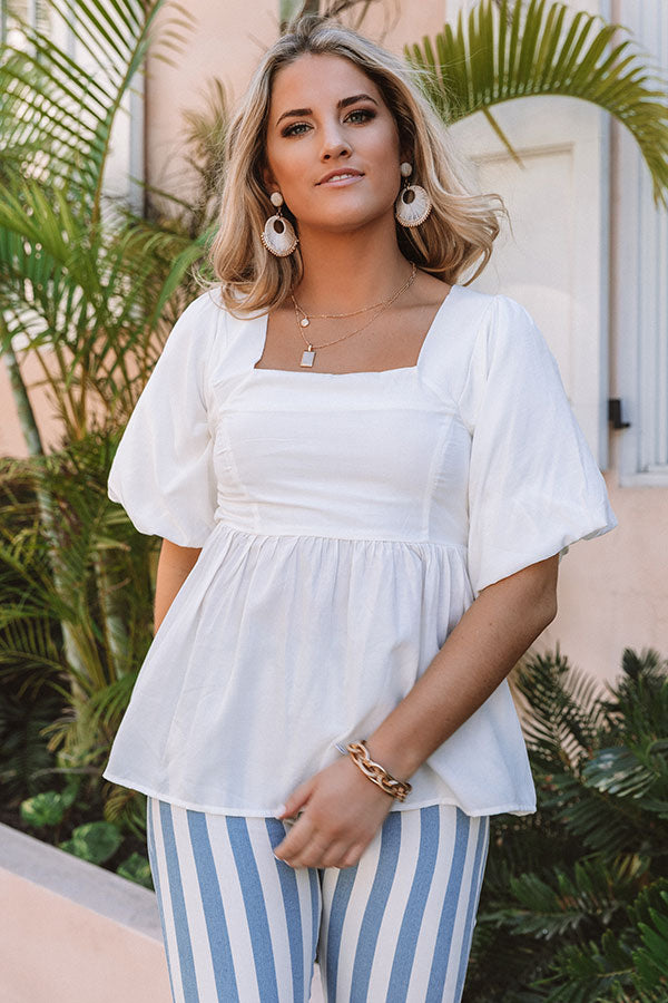 There is no better piece to wear for an exciting "round trip rendezvous" than this adorable white top featuring lightweight material, a square neckline and upper back with a tie string closure, oversized bubble half sleeves with fitted elastic banded cuffs, and a relaxed silhouette that falls into a peplum bottom with a straight neckline! We have styled this charming piece with some striped flares, statement earrings, and neutral platform heels, but you can also wear it with some distressed denim shorts, "The Lyla Sandal in Red," and our "Bryant Park Views Quilted Crossbody in Red!" Measurements