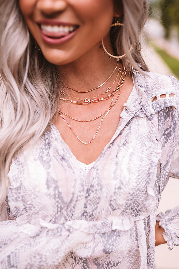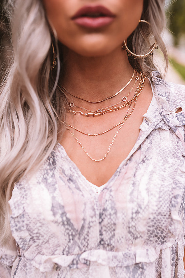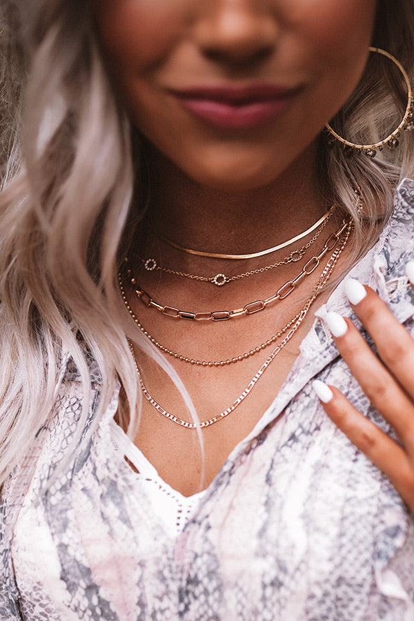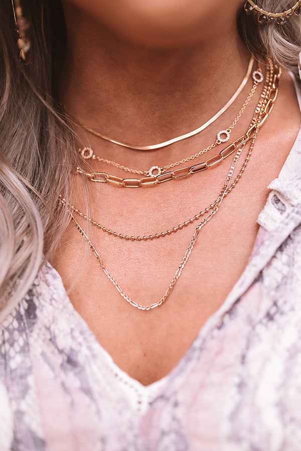 Glamorize your OOTD by accessorizing with our adorable "Royal Drama" necklace featuring five different layered gold chains!