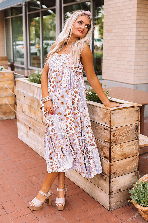 Twirl into style with our gorgeous 'RSVP Chic' midi dress featuring lightweight and flowy material patterned with a variety of camel and lilac hued floral patchwork prints, a square neckline and upper back with skinny sleeveless shoulder straps, and a relaxed silhouette that falls into a straight mid-calf length hemline!