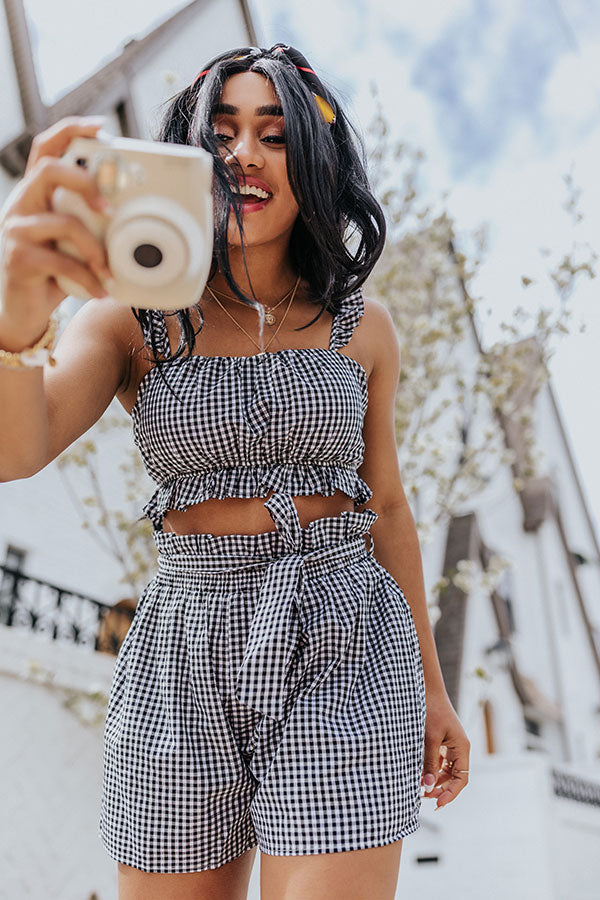 Stay flirty and fabulous in our trendy 'Ruffled Up' shorts featuring lightweight material patterned with a black and white gingham print, a high ruffle waistline with a tie belt, and a relaxed silhouette that ends in straight upper-thigh length hemlines!