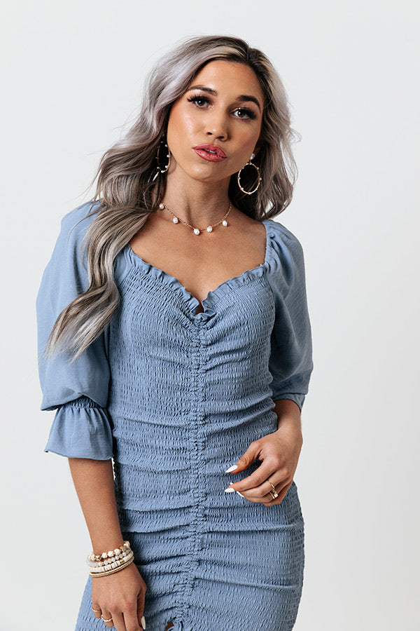 Compliments are sure to fly your way when you arrive in our gorgeous airy blue 'Rum Runner' dress featuring lightweight four-way stretch material, a cinched detail down the center front with a tie closure, a square neckline and upper back, long loose sleeves with flared cuffs, ruffled accent trim, and a flattering form fitting smocked silhouette that falls into a straight mid-thigh length hemline! Measurements