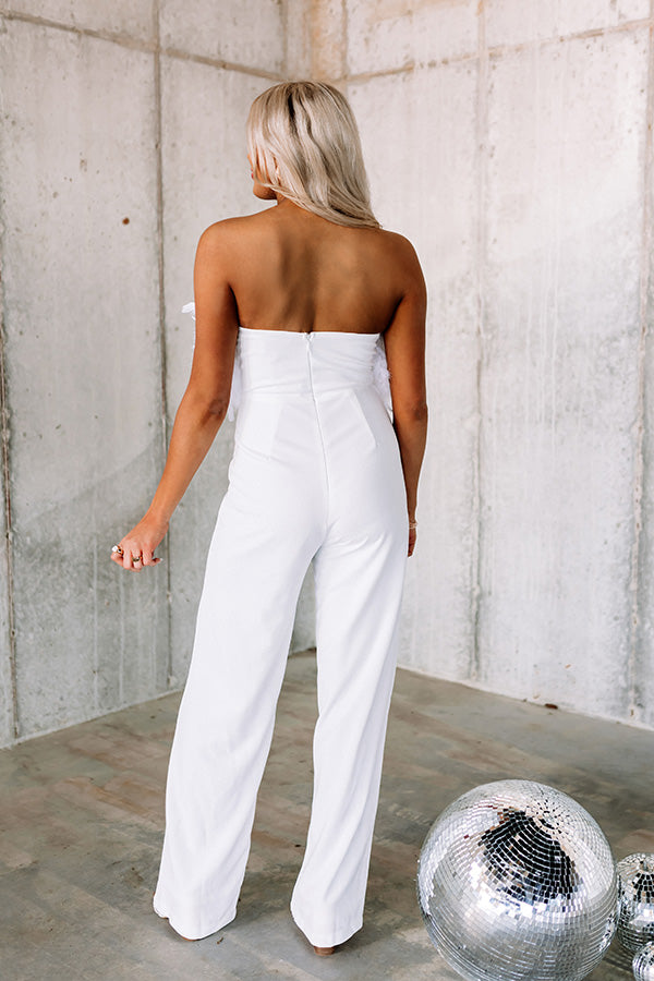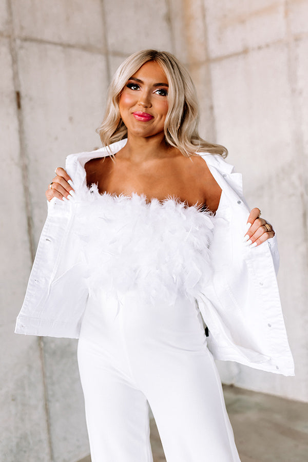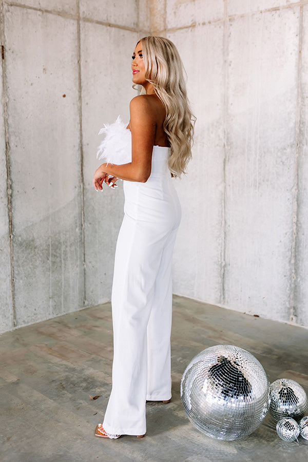 Make a fun statement in our eye-catching white 'Rumored Romance Jumpsuit' featuring lightweight material, a strapless feather bodice, a zip closure in the back, and a flattering pants silhouette that ends in straight ankle-length hemlines!