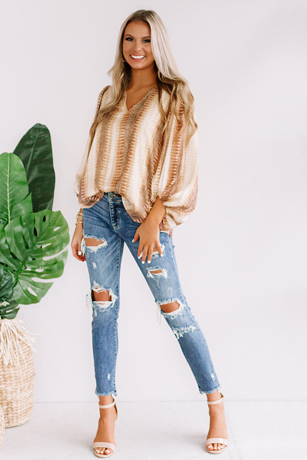 Transition from season to season in style with our brown hued "Runaway Fabulous" shift top featuring lightweight material, a bold black and neutral snake print pattern with subtle shimmer detailing, a v-cut neckline, long oversized semi-sheer bishop sleeves with fitted elastic banded cuffs, and a relaxed silhouette that falls into a rounded hemline! We have styled this striking piece with some black skinnies and a neutral bootie, faux suede hat, and fringe crossbody, but you can also wear it tucked into our "Name Dropper Faux Suede Skirt in Mocha" with "The Alice Faux Suede Thigh High Boot in Brown!" Measurements