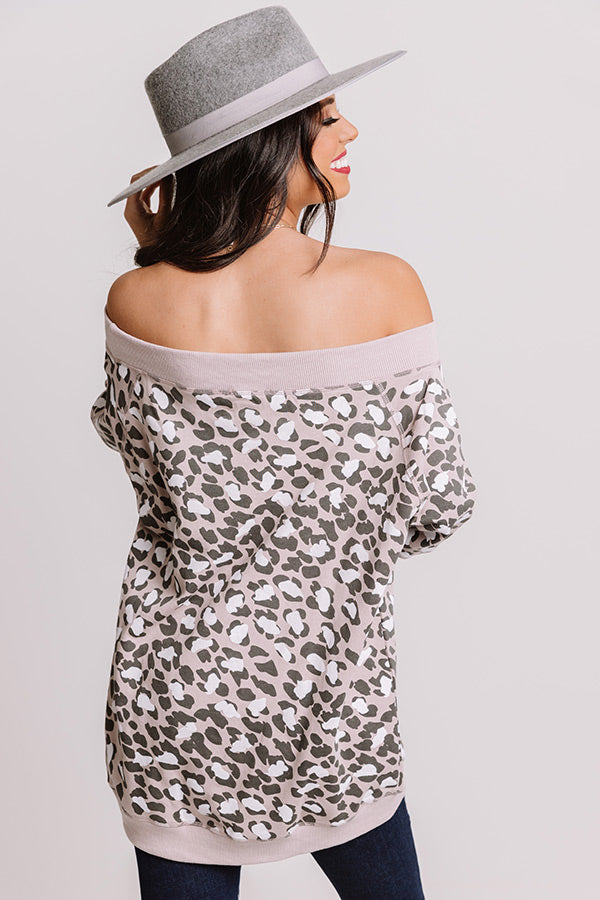 Let your style "run free" in this gorgeous dusty purple colored sweatshirt featuring ultra soft lightweight material patterned with a large black and white leopard print, an off shoulder fit with a straight neckline, oversized bubble drop sleeves with fitted cuffs, ribbed trim detailing, and a relaxed silhouette that falls into a straight tunic-length hemline!