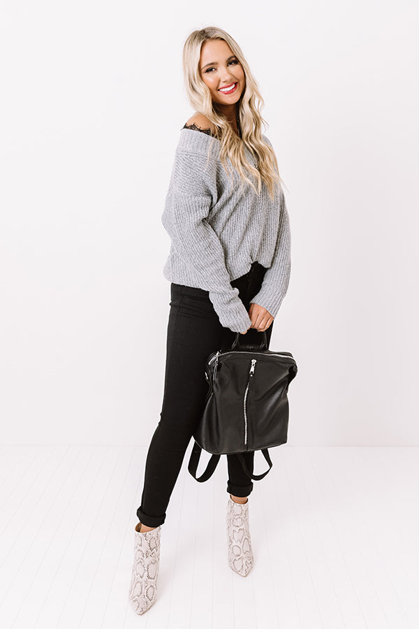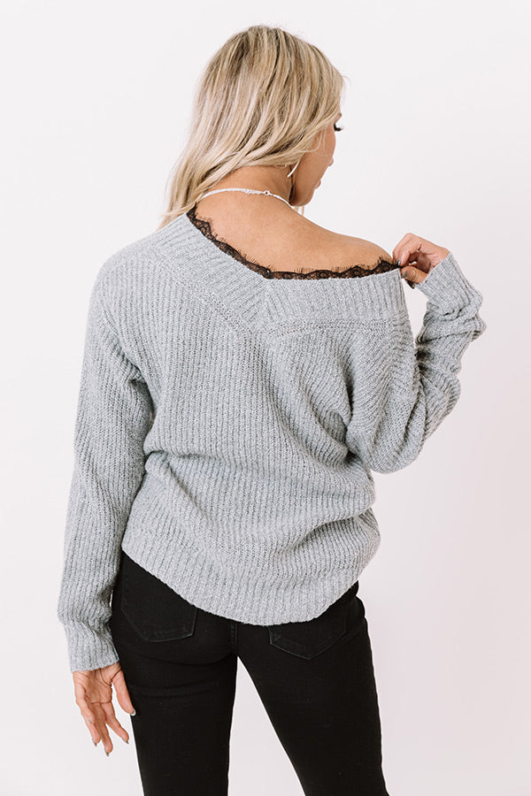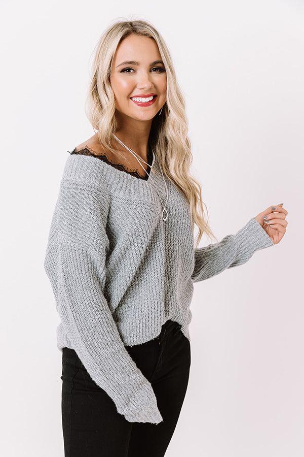 Achieve effortless style with our charming grey "Running On Coffee" sweater featuring soft lightweight tight knit material with subtle ribbed texturing, a v-cut neckline with intricate black lace trim detailing, long loose sleeves, and a relaxed silhouette that ends in a straight hemline with accent side slits!