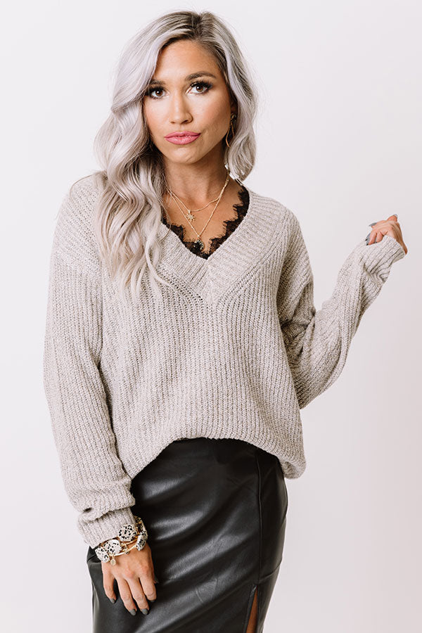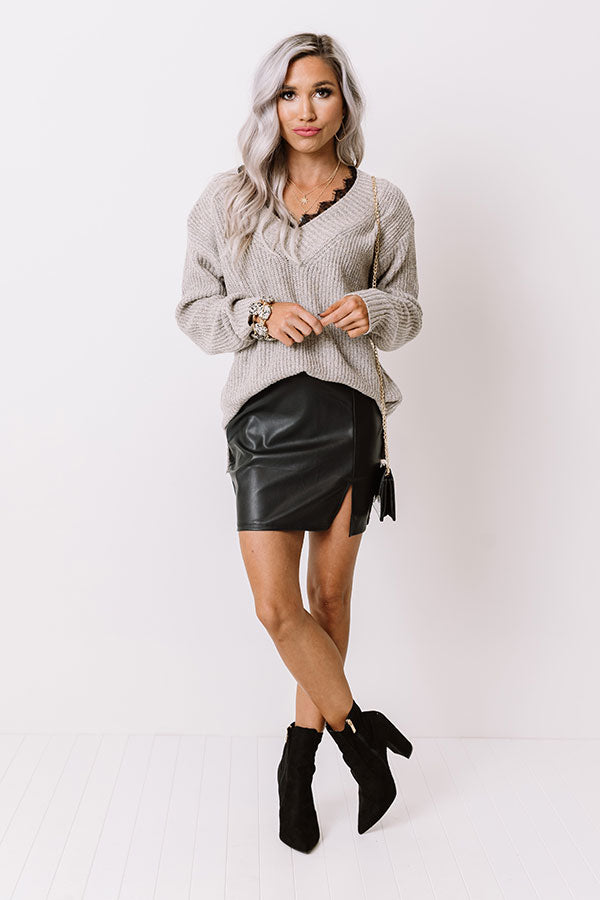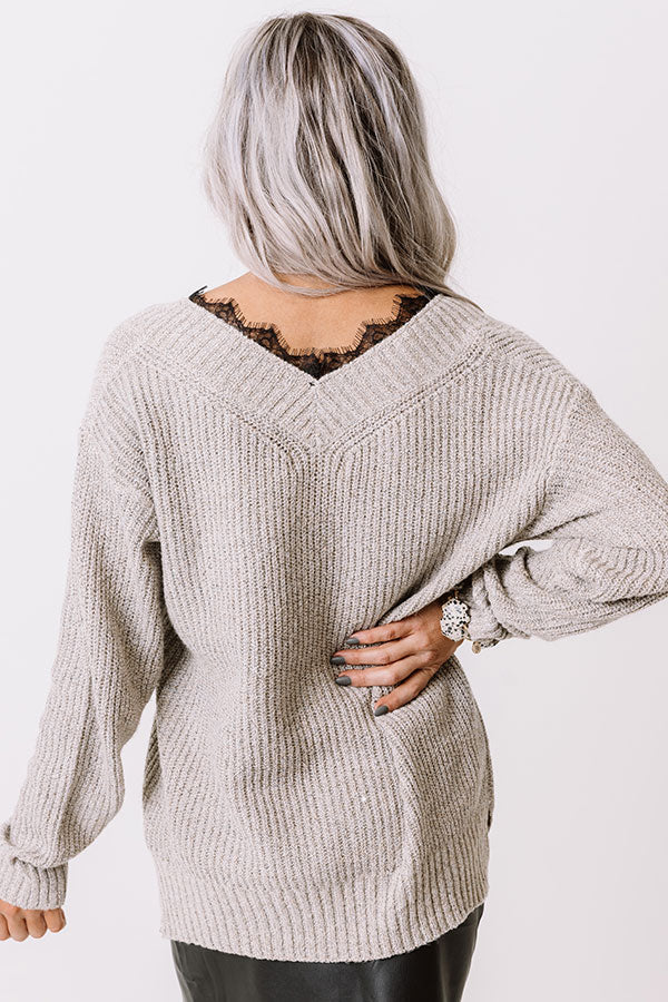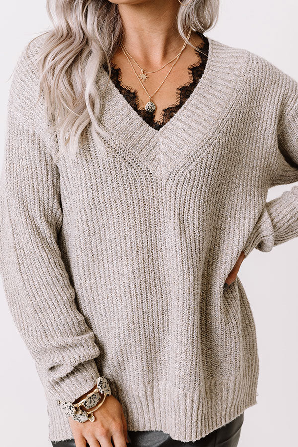 Achieve effortless style with our charming taupe colored "Running On Coffee" sweater featuring soft lightweight tight knit material with subtle ribbed texturing, a v-cut neckline with intricate black lace trim detailing, long loose sleeves, and a relaxed silhouette that ends in a straight hemline with accent side slits!