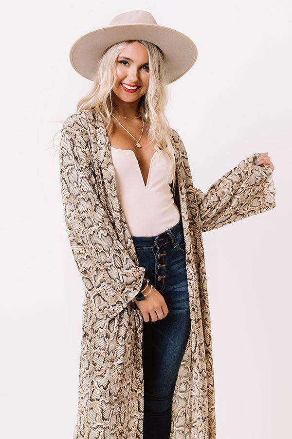 You will look like you just walked right out of a runway show when you complete your look with this striking brown duster featuring ultra lightweight breezy material patterned with a black snake print, long loose sleeves, and a draped open front silhouette that cascades into a straight mid-calf length hemline with accent side slits! Measurements