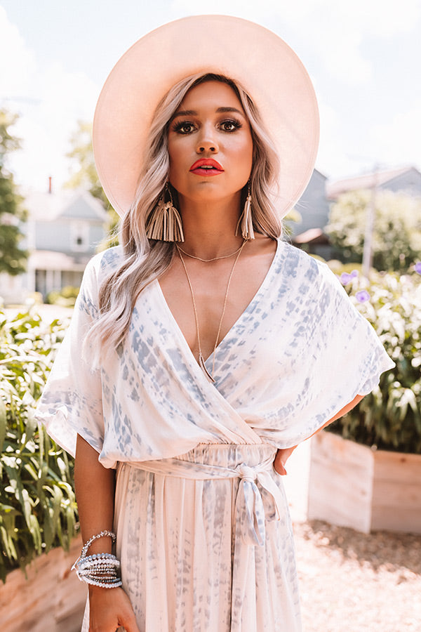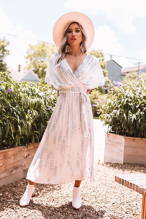 Set sail in style with this stunning cream colored midi dress featuring lightweight breezy material patterned with blue/grey hued tie dye, a wrap bodice with a v-cut neckline, oversized bat wing half sleeves, a cinched waistline with a tie belt, an ultra relaxed skirt silhouette that falls into a straight mid-calf length hemline with high accent side slits! We have styled this cutie with a matching wedged bootie and wool hat, but you can also wear it with "The Jess Faux Leather Heel in Grey" and our "Style Profile Faux Leather Tote in Grey!" Measurements