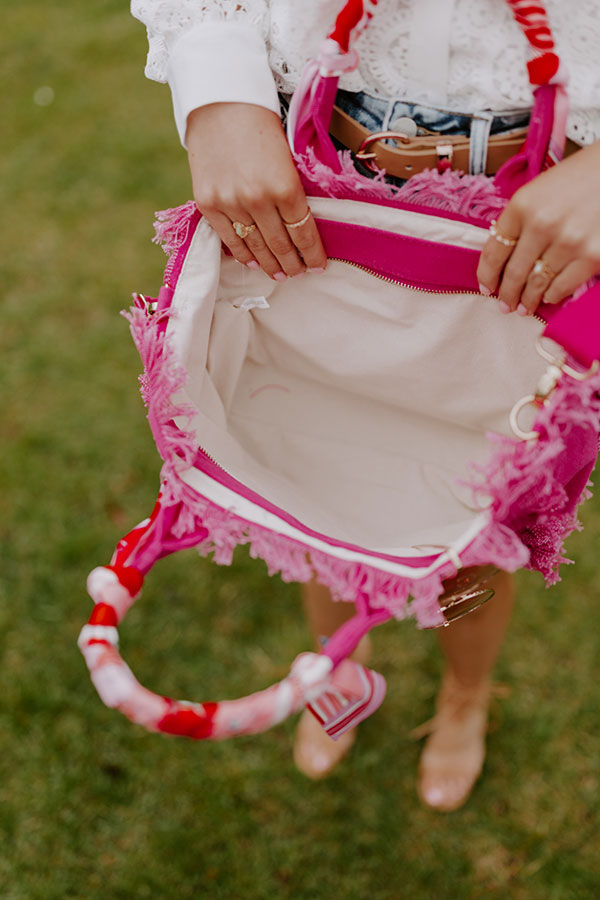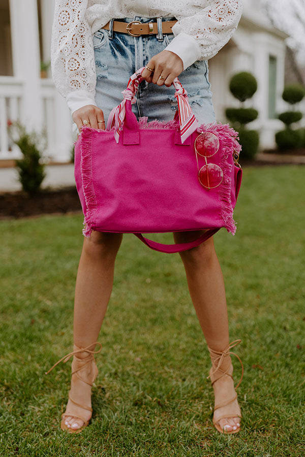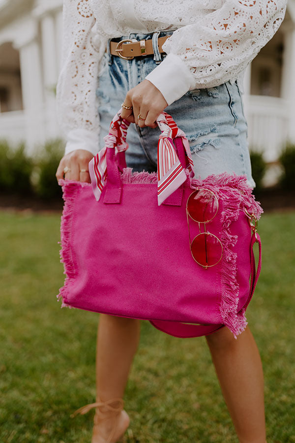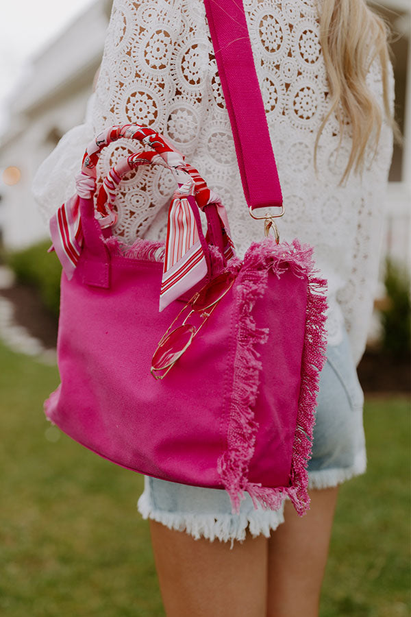 You won't find a more practical yet pretty bag than our hot pink 'Sailing Away' tote featuring durable canvas material with fringe detailing, two tote handles wrapped in scarves, a removable and adjustable shoulder strap, and a spacious fully lined interior with a zip closure!