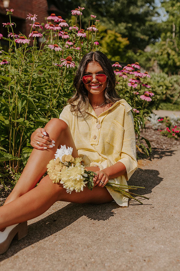 Keep casual in our simple but stylish yellow 'Sailing Away' top featuring lightweight material with waffle knit texturing, a button up bodice with a collared neckline, a single accent chest pocket, loose half sleeves, and a relaxed silhouette that falls into a straight hemline! on products
