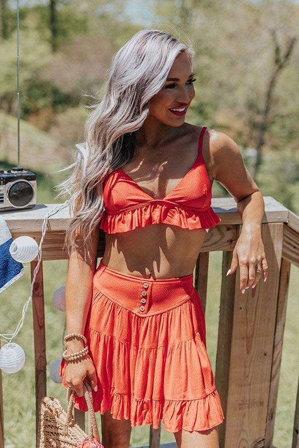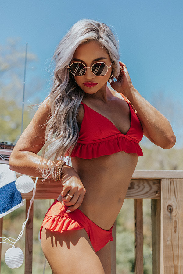 All eyes are sure to be on you in our flirty red 'Salt And Sand Bikini Top' featuring lightweight four-way stretch material, a deep v-cut neckline with adjustable spaghetti straps, and a flattering triangle bodice that ends in a ruffled hemline with a hook closure in the back! This bikini top comes with removable padding