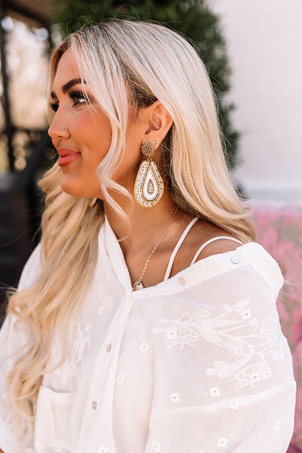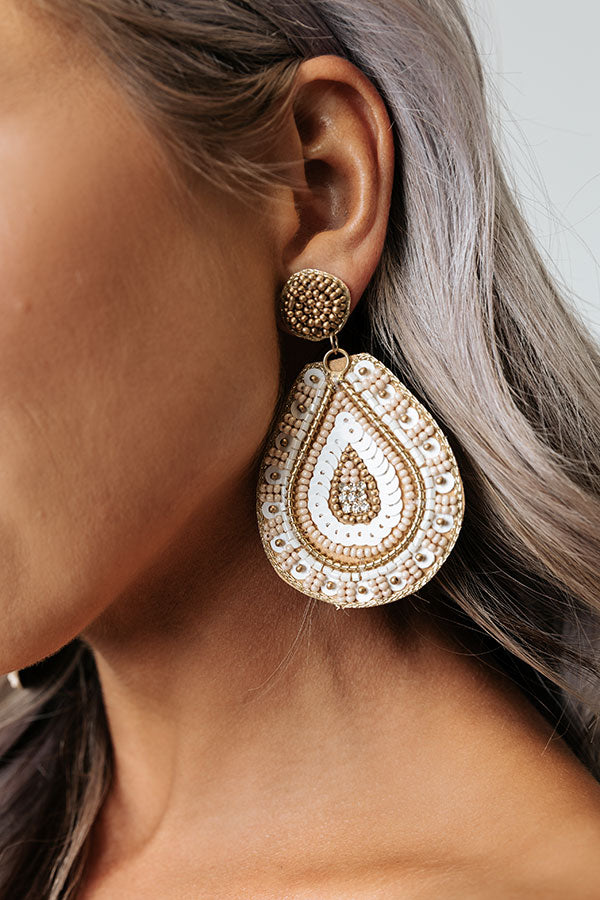 Wow the crowd by accessorizing with our gorgeous 'Salted Caramel Kisses' statement earrings featuring bronze beaded studs and oversized gold and white beaded and sequin teardrops!