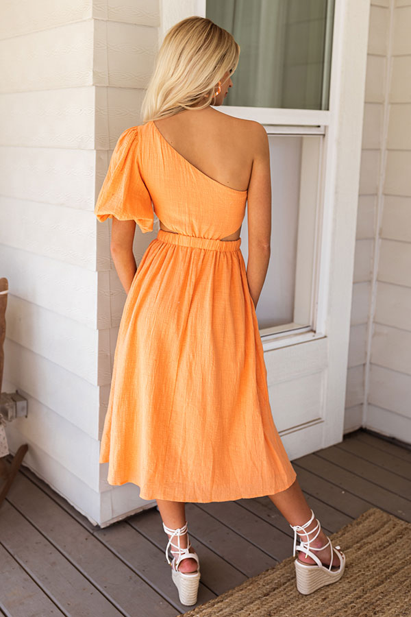 Stay flirty in our flattering orange 'Saltwater Taffy' dress featuring lightweight material, a diagonal neckline and upper back with a single short puff sleeves, accent side cutouts, and a relaxed silhouette that falls into a straight mid-calf length hemline! on products