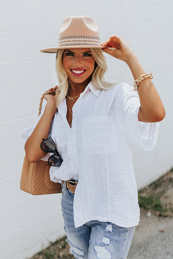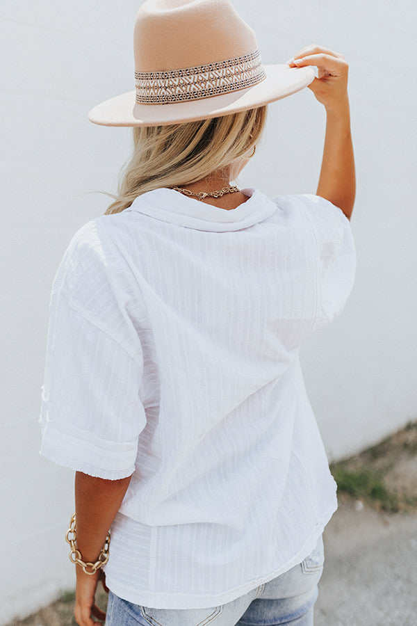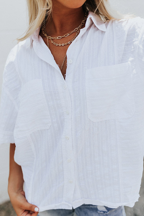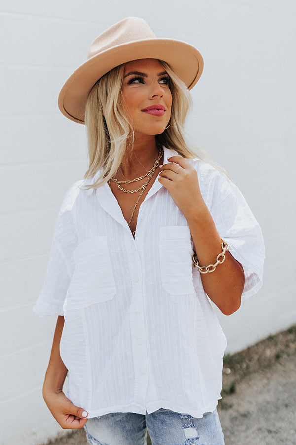 Breeze from season to season in this white casual cute top featuring lightweight flowy material with linen-like texturing, a button down front with a collared neckline, short loose sleeves, two accent chest pockets, and a slouched silhouette that falls into a straight hemline! Measurements