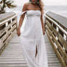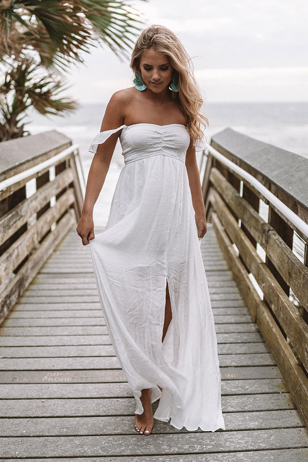 This gorgeous white maxi dress has a smocked elastic upper bodice, flirty flutter sleeves that rest off of your shoulders & an empire waist that falls into a breezy floor-length rayon maxi skirt.