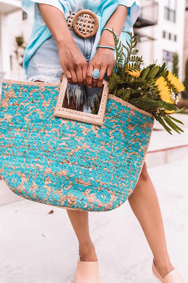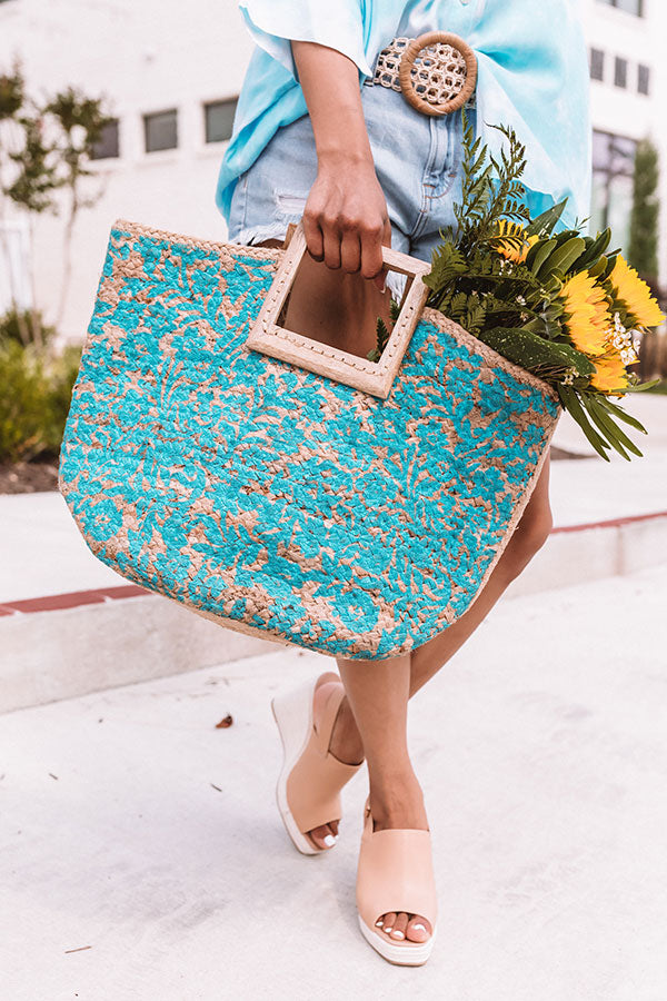 Head to vacay or happy hour in style with our versatile "Sand Castle" tote featuring lightweight woven material with an embroidered ocean blue floral print, two square handles, and a rounded spacious pouch!